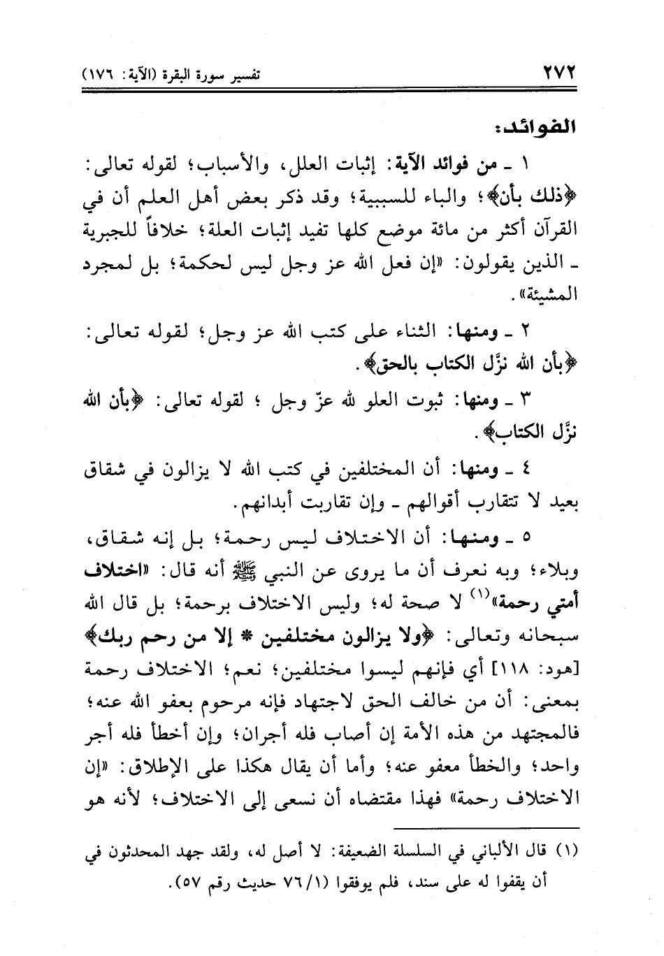٥ ــ ومنها: أن الاختلاف ليس رحمة؛ بل إنه شقاق، وبلاء؛ وبه نعرف أن ما يروى عن النبي صلى الله عليه وسلم أنه قال: «اختلاف أمتي رحمة» (¬١) لا صحة له؛ وليس الاختلاف برحمة؛ بل قال الله سبحانه وتعالى: {ولا يزالون مختلفين * إلا من رحم ربك} [هود: ١١٨] أي فإنهم ليسوا مختلفين؛ نعم؛ الاختلاف رحمة بمعنى: أن من خالف الحق لاجتهاد فإنه مرحوم بعفو الله عنه؛ فالمجتهد من هذه الأمة إن أصاب فله أجران؛ وإن أخطأ فله أجر واحد؛ والخطأ معفو عنه؛ وأما أن يقال هكذا على الإطلاق: «إن الاختلاف رحمة» فهذا مقتضاه أن نسعى إلى الاختلاف؛ لأنه هو
