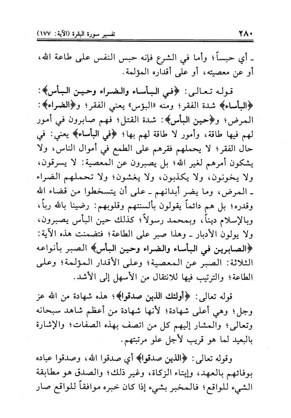 قوله تعالى: {في البأساء والضراء وحين البأس}: {البأساء} شدة الفقر؛ ومنه «البؤس» يعني الفقر؛ و {الضراء}: المرض؛ و {حين البأس}: شدة القتل؛ فهم صابرون في أمور لهم فيها طاقة، وأمور لا طاقة لهم بها؛ {في البأساء} يعني: في حال الفقر؛ لا يحملهم فقرهم على الطمع في أموال الناس، ولا يشكون أمرهم لغير الله؛ بل يصبرون عن المعصية: لا يسرقون، ولا يخونون، ولا يكذبون، ولا يغشون؛ ولا تحملهم الضراء - المرض، وما يضر أبدانهم - على أن يتسخطوا من قضاء الله وقدره؛ بل هم دائماً يقولون بألسنتهم وقلوبهم: رضينا بالله رباً، وبالإسلام ديناً، وبمحمد رسولاً؛ كذلك حين البأس يصبرون، ولا يولون الأدبار - وهذا صبر على الطاعة؛ فتضمنت هذه الآية: {الصابرين في البأساء والضراء وحين البأس} الصبر بأنواعه الثلاثة: الصبر عن المعصية؛ وعلى الأقدار المؤلمة؛ وعلى الطاعة؛ والترتيب فيها للانتقال من الأسهل إلى الأشد.