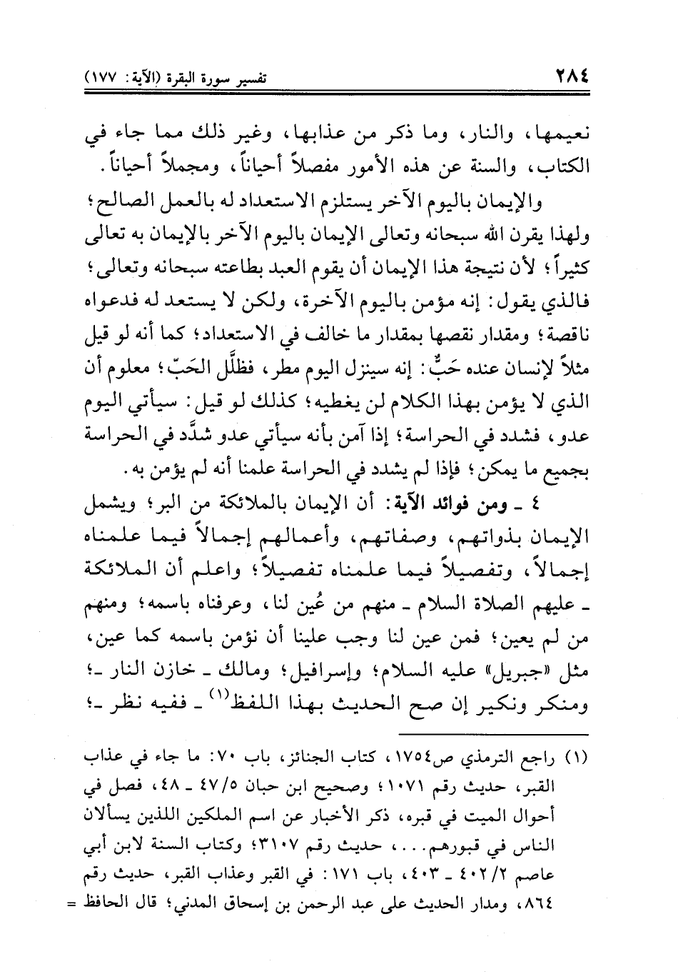 ٤ ــ ومن فوائد الآية: أن الإيمان بالملائكة من البر؛ ويشمل الإيمان بذواتهم، وصفاتهم، وأعمالهم إجمالاً فيما علمناه إجمالاً، وتفصيلاً فيما علمناه تفصيلاً؛ واعلم أن الملائكة - عليهم الصلاة السلام - منهم من عُين لنا، وعرفناه باسمه؛ ومنهم من لم يعين؛ فمن عين لنا وجب علينا أن نؤمن باسمه كما عين، مثل «جبريل» عليه السلام؛ وإسرافيل؛ ومالك - خازن النار -؛ ومنكر ونكير إن صح الحديث بهذا اللفظ (¬١)