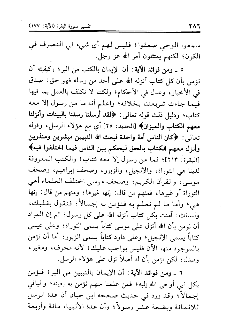 ٥ ــ ومن فوائد الآية: أن الإيمان بالكتب من البر؛ وكيفيته أن نؤمن بأن كل كتاب أنزله الله على أحد من رسله فهو حق: صدق في الأخبار، وعدل في الأحكام؛ ولكننا لا نكلف بالعمل بما فيها فيما جاءت شريعتنا بخلافه؛ واعلم أنه ما من رسول إلا معه كتاب؛ ودليل ذلك قوله تعالى: {لقد أرسلنا رسلنا بالبينات وأنزلنا معهم الكتاب والميزان} [الحديد: ٢٥] أي مع هؤلاء الرسل، وقوله تعالى: {كان الناس أمة واحدة فبعث الله النبيين مبشرين ومنذرين وأنزل معهم الكتاب بالحق ليحكم بين الناس فيما اختلفوا فيه} [البقرة: ٢١٣]؛ فما من رسول إلا معه كتاب؛ والكتب المعروفة لدينا هي التوراة، والإنجيل، والزبور، وصحف إبراهيم، وصحف موسى، والقرآن الكريم؛ وصحف موسى اختلف العلماء أهي التوراة أو غيرها، فمنهم من قال: إنها غيرها؛ ومنهم من قال: إنها هي؛ وأما ما لم نعلم به فنؤمن به إجمالاً؛ فتقول بقلبك، ولسانك: آمنت بكل كتاب أنزله الله على كل رسول؛ ثم إن المراد أن نؤمن بأن الله أنزل على موسى كتاباً يسمى التوراة؛ وعلى عيسى كتاباً يسمى الإنجيل؛ وعلى داود كتاباً يسمى الزبور؛ أما أن تؤمن بالموجود منها الآن فليس بواجب عليك؛ لأنه محرف، ومغير، ومبدل؛ لكن تؤمن بأن له أصلاً نزل على هؤلاء الرسل.