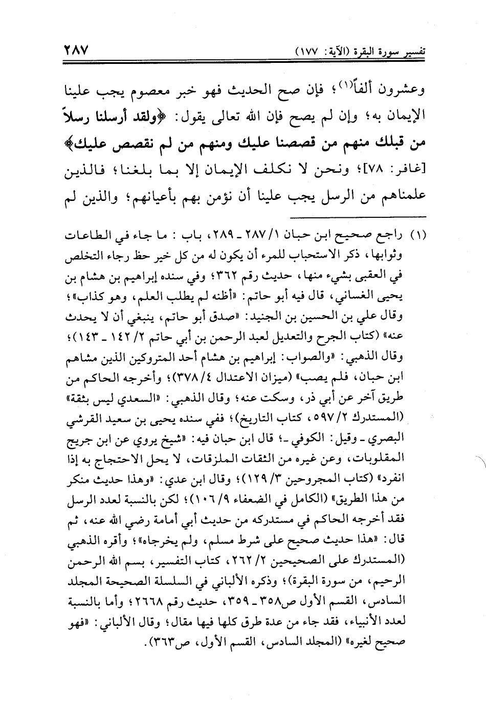 (¬١) راجع صحيح ابن حبان ١/ ٢٨٧ - ٢٨٩، باب: ما جاء في الطاعات وثوابها، ذكر الاستحباب للمرء ان يكون له من كل خير حظ رجاء التخلص في العقبى بشيء منها، حديث رقم ٣٦٢؛ وفي سنده إبراهيم بن هشام بن يحيى الغساني، قال فيه أيو حاتم: "أظنه لم يطلب العلم، وهو كذاب"؛ وقال علي بن الحسين بن الجنيد: "صدق أبو حاتم، ينبغي أن لا يحدث عنه" (كتاب الجرح والتعديل لعبد الرحمن بن أبي حاتم ٢/ ١٤٢ - ١٤٣)؛ وقال الذهبي: "والصواب: إبراهيم بن هشام أحد المتروكين الذين مشاهم ابن حبان، فلم يصب" (ميزان الاعتدال ٤/ ٣٧٨)؛ وأخرجه الحاكم من طريق آخر عن أبي ذر وسكت عنه وقال الذهبي السعدي ليس بثقة (المستدرك ٢/ ٥٩٧، كتاب التاريخ)؛ ففي سنده يحيى بن سعيد القرشي البصري - وقيل: الكوفي -؛ قال ابن حبان فيه: "شيخ يروي عن ابن جريج المقلوبات، وعن غيره من الثقات الملزقات، لا يحل= = الاحتجاج به إذا انفرد" (كتاب المجروحين ٣/ ١٢٩)؛ وقال ابن عدي: "وهذا حديث منكر من هذا الطريق" (الكامل في الضعفاء ٩/ ١٠٦)؛ لكن بالنسبة لعدد الرسل فقد أخرجه الحاكم في مستدركه من حديث أبي أمامه رضي الله عنه، ثم قال: "هذا حديث صحيح على شرط مسلم، ولم يخرجاه"؛ وأقره الذهبي (المستدرك على الصحيحين ٢/ ٢٦٢، كتاب التفسير، بسم الله الرحمن الرحيم، من سورة البقرة)؛ وذكره الألباني في السلسلة الصحيحة المجلد السادس، القسم الأول ص ٣٥٨ - ٣٥٩، حديث رقم ٢٦٦٨؛ وأما بالنسبة لعدد الأنبياء، فقد جاء من عدة طرق كلها فيها مقال؛ وقال الألباني: "فهو صحيح لغيره" (المجلد السادس، القسم الأول، ص ٣٦٣).