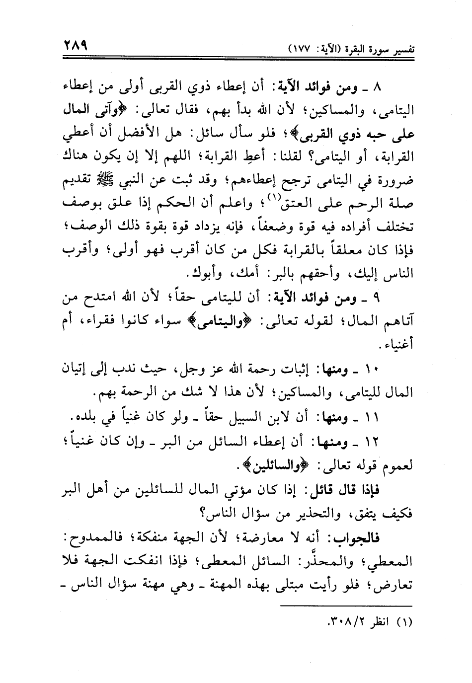 ٨ ــ ومن فوائد الآية: أن إعطاء ذوي القربى أولى من إعطاء اليتامى، والمساكين؛ لأن الله بدأ بهم، فقال تعالى: {وآتى المال على حبه ذوي القربى}؛ فلو سأل سائل: هل الأفضل أن أعطي القرابة، أو اليتامى؟ لقلنا: أعطِ القرابة؛ اللهم إلا إن يكون هناك ضرورة في اليتامى ترجح إعطاءهم؛ وقد ثبت عن النبي صلى الله عليه وسلم تقديم صلة الرحم على العتق (¬١)؛ واعلم أن الحكم إذا علق بوصف تختلف أفراده فيه قوة وضعفاً، فإنه يزداد قوة بقوة ذلك الوصف؛ فإذا كان معلقاً بالقرابة فكل من كان أقرب فهو أولى؛ وأقرب الناس إليك، وأحقهم بالبر: أمك، وأبوك.