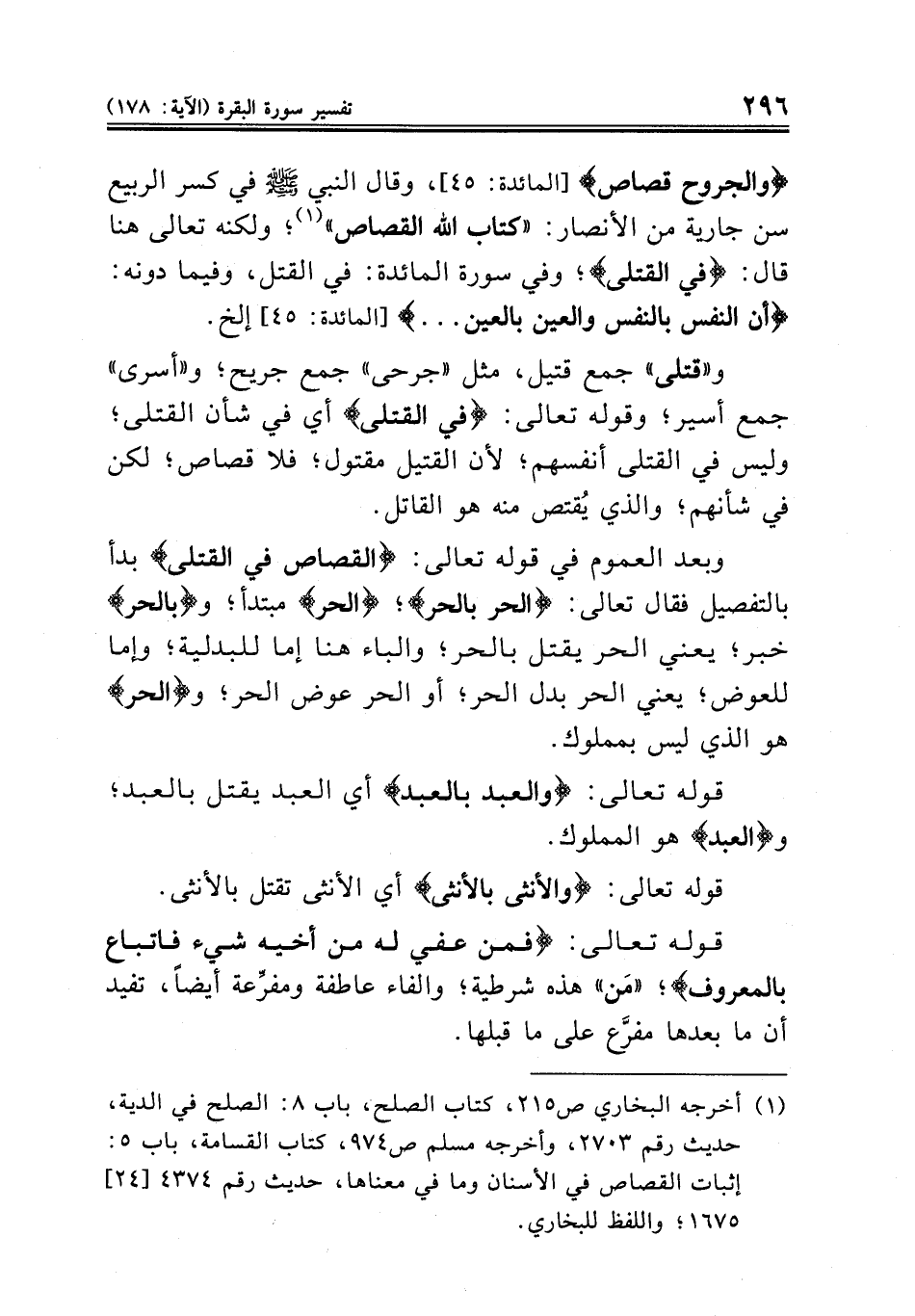 وبعد العموم في قوله تعالى: {القصاص في القتلى} بدأ بالتفصيل فقال تعالى: {الحر بالحر}؛ {الحر مبتدأ؛ و {بالحر} خبر؛ يعني الحر يقتل بالحر؛ والباء هنا إما للبدلية؛ وإما للعوض؛ يعني الحر بدل الحر؛ أو الحر عوض الحر؛ و {الحر} هو الذي ليس بمملوك.