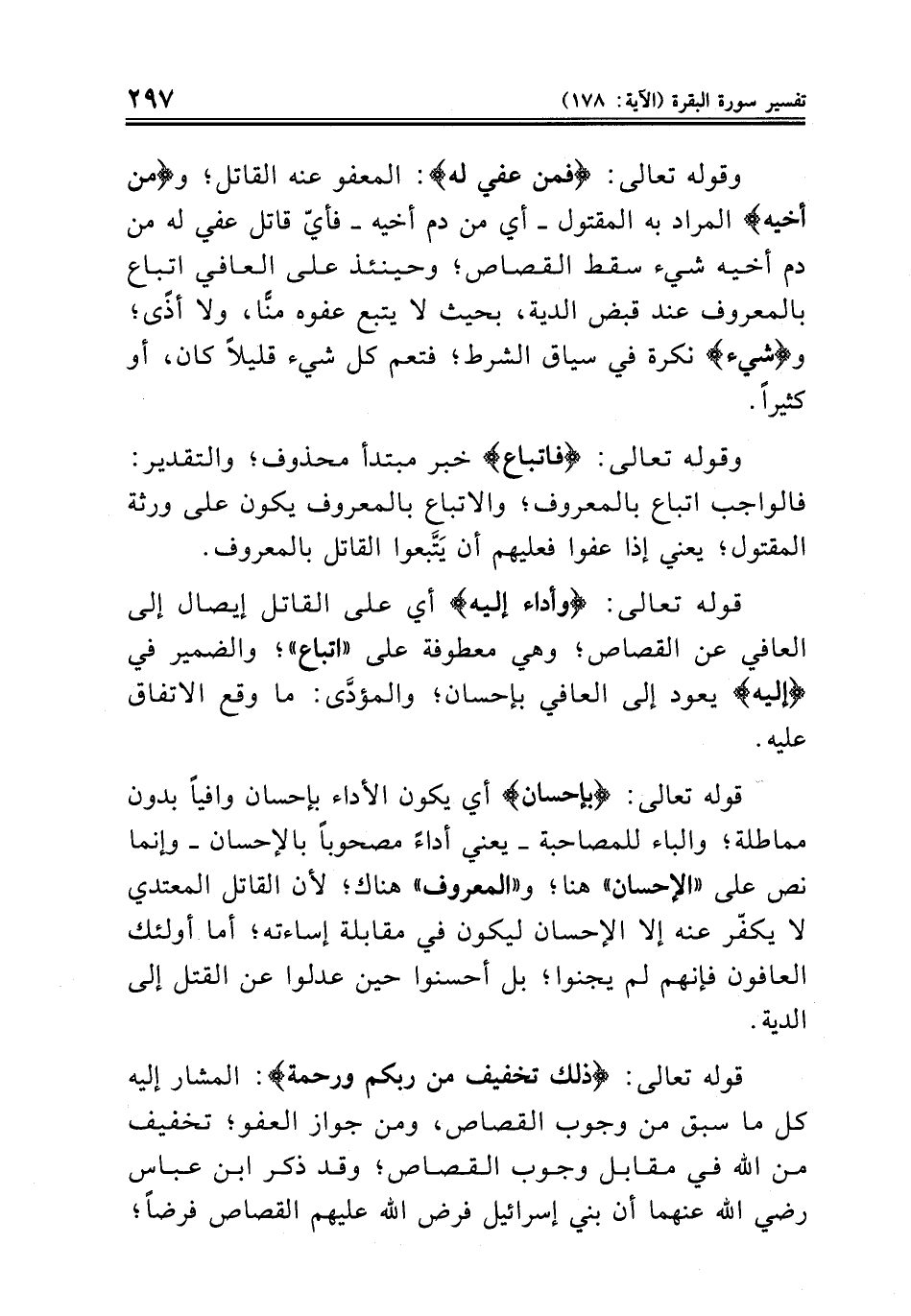 وقوله تعالى: {فمن عفي له}: المعفو عنه القاتل؛ و {من أخيه} المراد به المقتول ــ أي من دم أخيه فأيّ قاتل عفي له من دم أخيه شيء سقط القصاص؛ وحينئذ على العافي اتباع بالمعروف عند قبض الدية، بحيث لا يتبع عفوه منًّا، ولا أذًى؛ و {شيء} نكرة في سياق الشرط؛ فتعم كل شيء قليلاً كان، أو كثيراً.