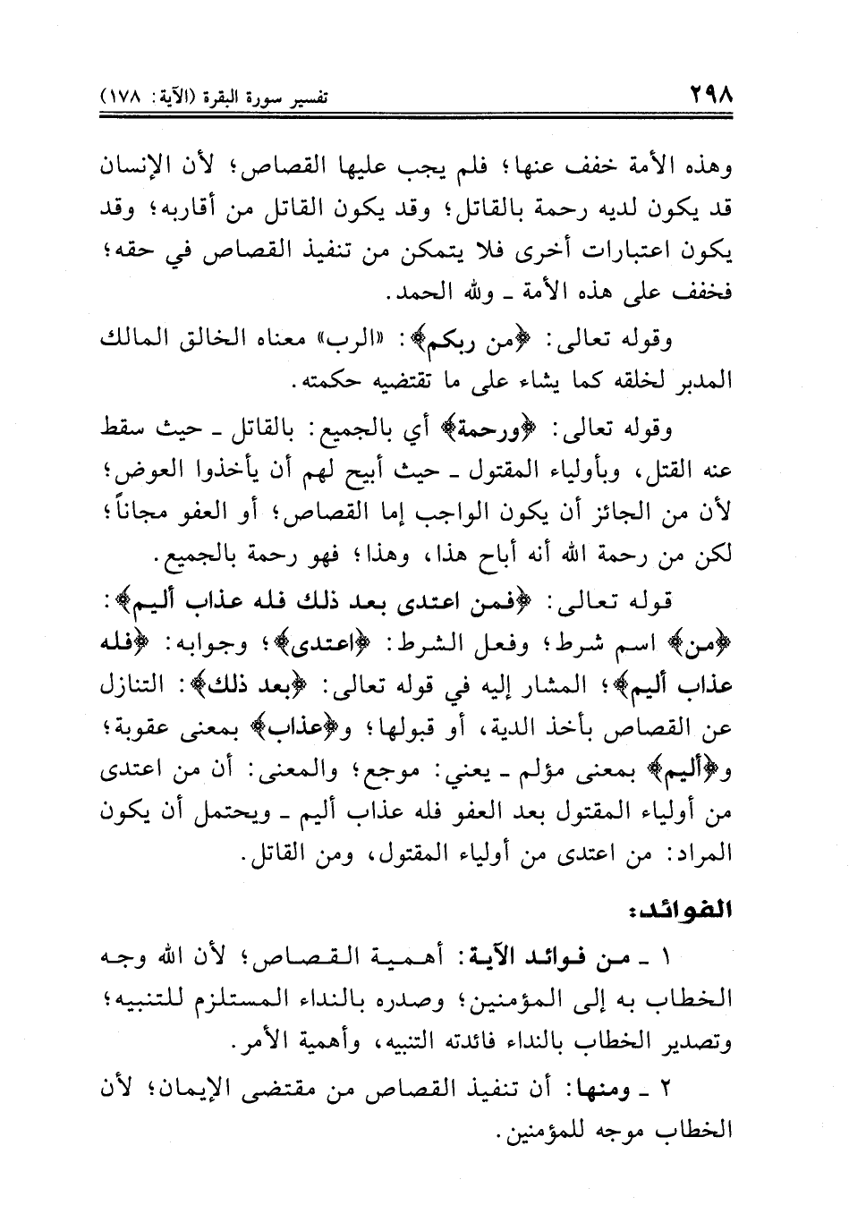١ ــ من فوائد الآية: أهمية القصاص؛ لأن الله وجه الخطاب به إلى المؤمنين؛ وصدره بالنداء المستلزم للتنبيه؛ وتصدير الخطاب بالنداء فائدته التنبيه، وأهمية الأمر.