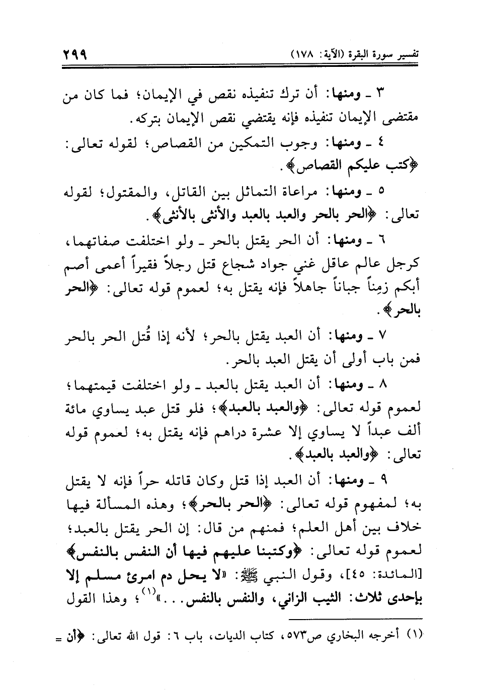 (¬١) أخرجه البخاري ص ٥٧٣، كتاب الديات، باب ٦: قول الله تعالىك ٠ ان النفس بالنفس والعين بالعين)، حديث رقم ٦٨٧٨، وأخرجه مسلم ص ٩٧٤، كتاب القسامة، باب ٦: ما يباح به دم المسلم، حديث رقم ٤٣٧٥ [٢٥] ١٦٧٦.