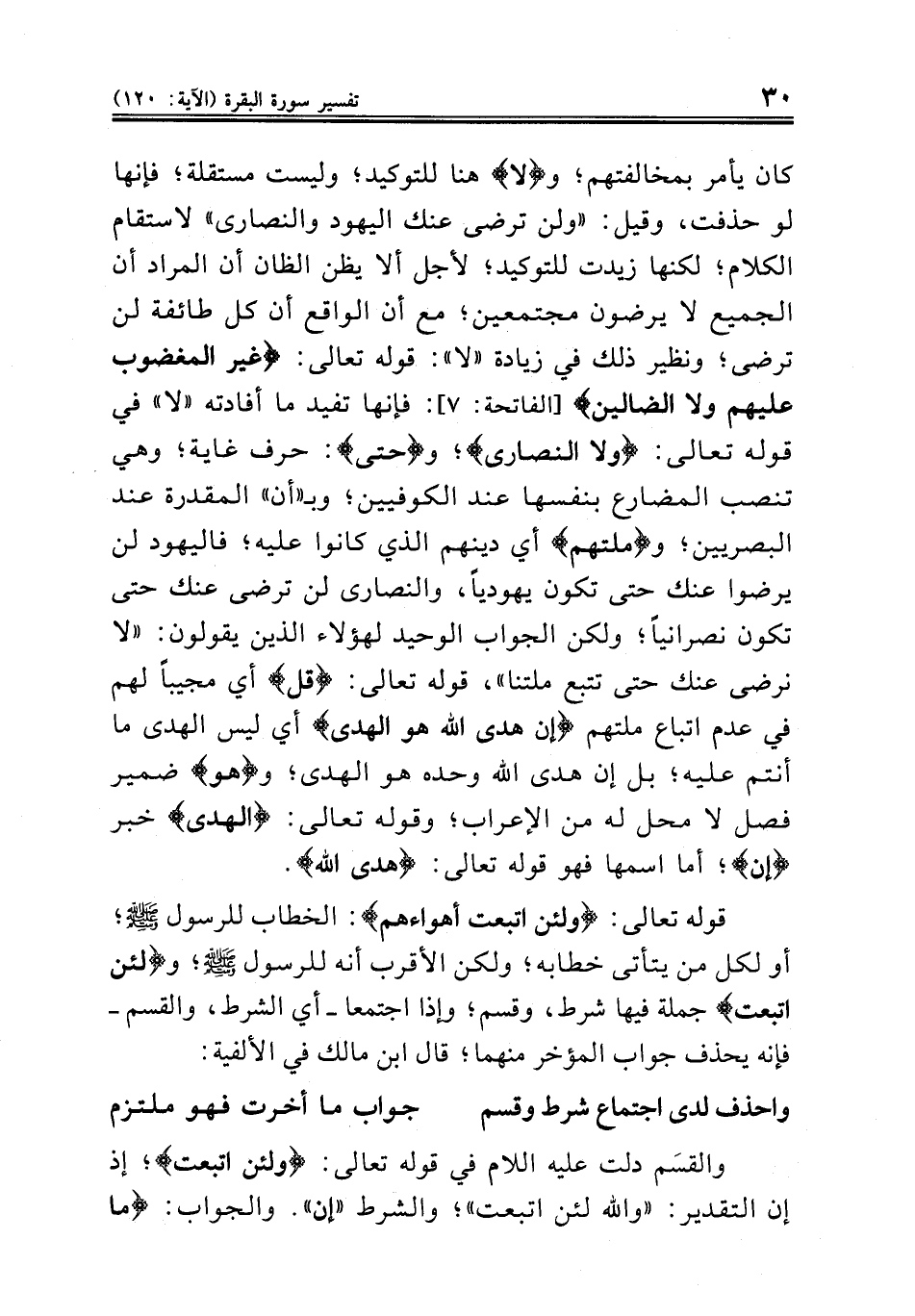 كان يأمر بمخالفتهم؛ و {لا} هنا للتوكيد؛ وليست مستقلة؛ فإنها لو حذفت، وقيل: «ولن ترضى عنك اليهود والنصارى» لاستقام الكلام؛ لكنها زيدت للتوكيد؛ لأجل ألا يظن الظان أن المراد أن الجميع لا يرضون مجتمعين؛ مع أن الواقع أن كل طائفة لن ترضى؛ ونظير ذلك في زيادة «لا»: قوله تعالى: {غير المغضوب عليهم ولا الضالين} [الفاتحة: ٧]: فإنها تفيد ما أفادته «لا» في قوله تعالى: {ولا النصارى و {حتى}: حرف غاية؛ وهي تنصب المضارع بنفسها عند الكوفيين؛ وبـ «أن» المقدرة عند البصريين؛ و {ملتهم} أي دينهم الذي كانوا عليه؛ فاليهود لن يرضوا عنك حتى تكون يهودياً، والنصارى لن ترضى عنك حتى تكون نصرانياً؛ ولكن الجواب الوحيد لهؤلاء الذين يقولون: «لا نرضى عنك حتى تتبع ملتنا»، قوله تعالى: {قل أي مجيباً لهم في عدم اتباع ملتهم {إن هدى الله هو الهدى} أي ليس الهدى ما أنتم عليه؛ بل إن هدى الله وحده هو الهدى؛ و {هو} ضمير فصل لا محل له من الإعراب؛ وقوله تعالى: {الهدى} خبر {إن}؛ أما اسمها فهو قوله تعالى: {هدى الله}.