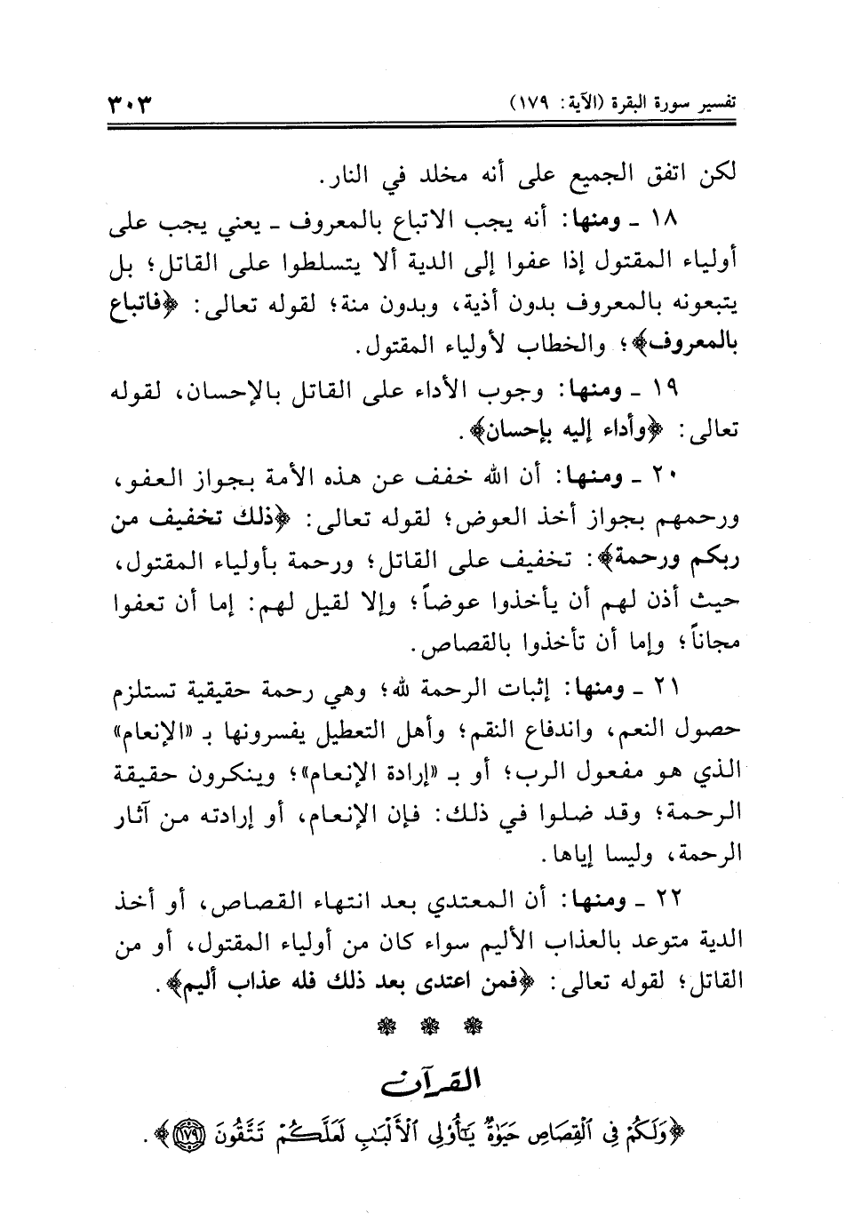٢٢ ــ ومنها: أن المعتدي بعد انتهاء القصاص، أو أخذ الدية متوعد بالعذاب الأليم سواء كان من أولياء المقتول، أو من القاتل؛ لقوله تعالى: {فمن اعتدى بعد ذلك فله عذاب أليم}.