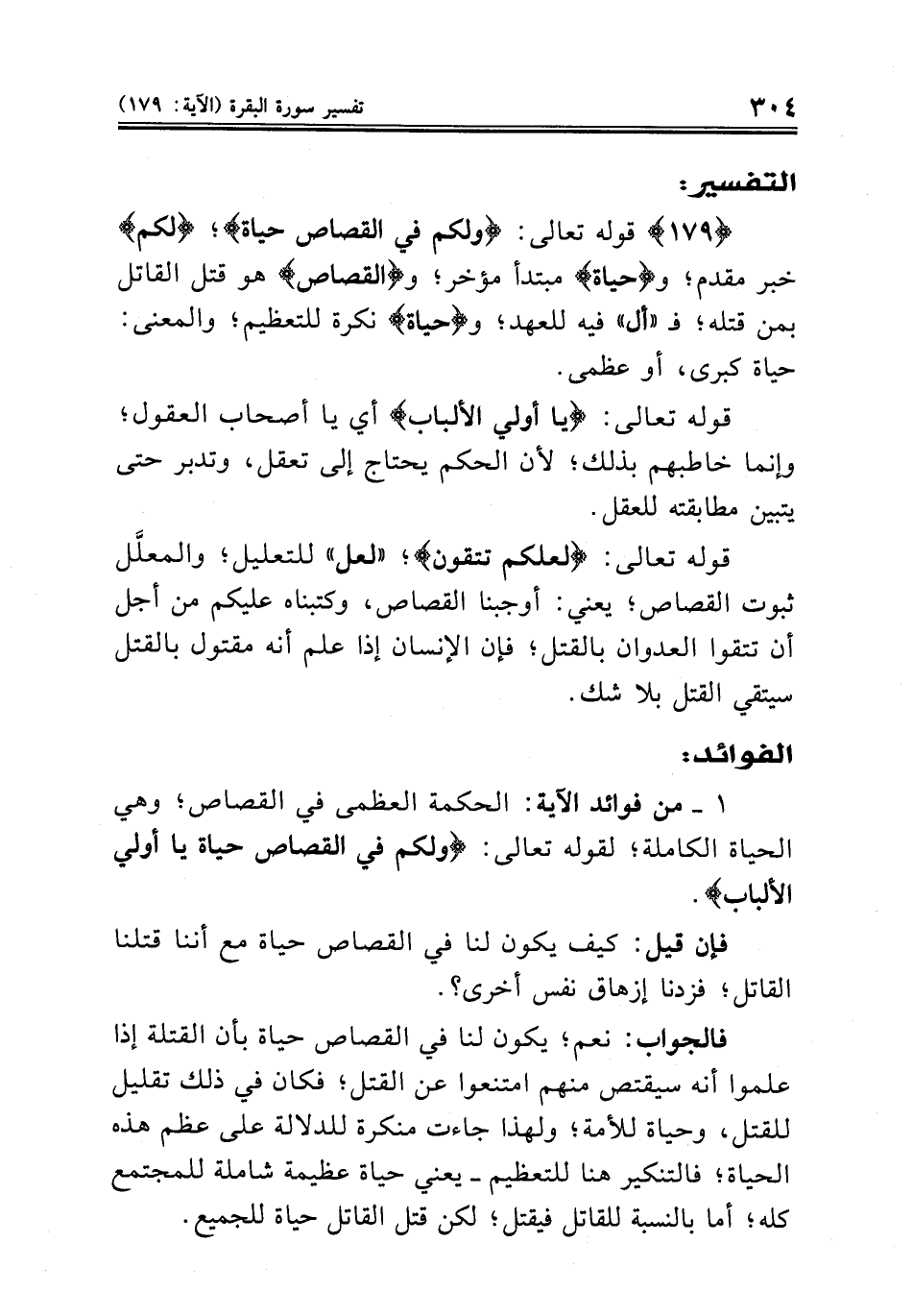 {١٧٩} قوله تعالى: {ولكم في القصاص حياة}؛ {لكم} خبر مقدم؛ و {حياة} مبتدأ مؤخر؛ و {القصاص هو قتل القاتل بمن قتله؛ فـ «أل» فيه للعهد؛ و {حياة} نكرة للتعظيم؛ والمعنى: حياة كبرى، أو عظمى.