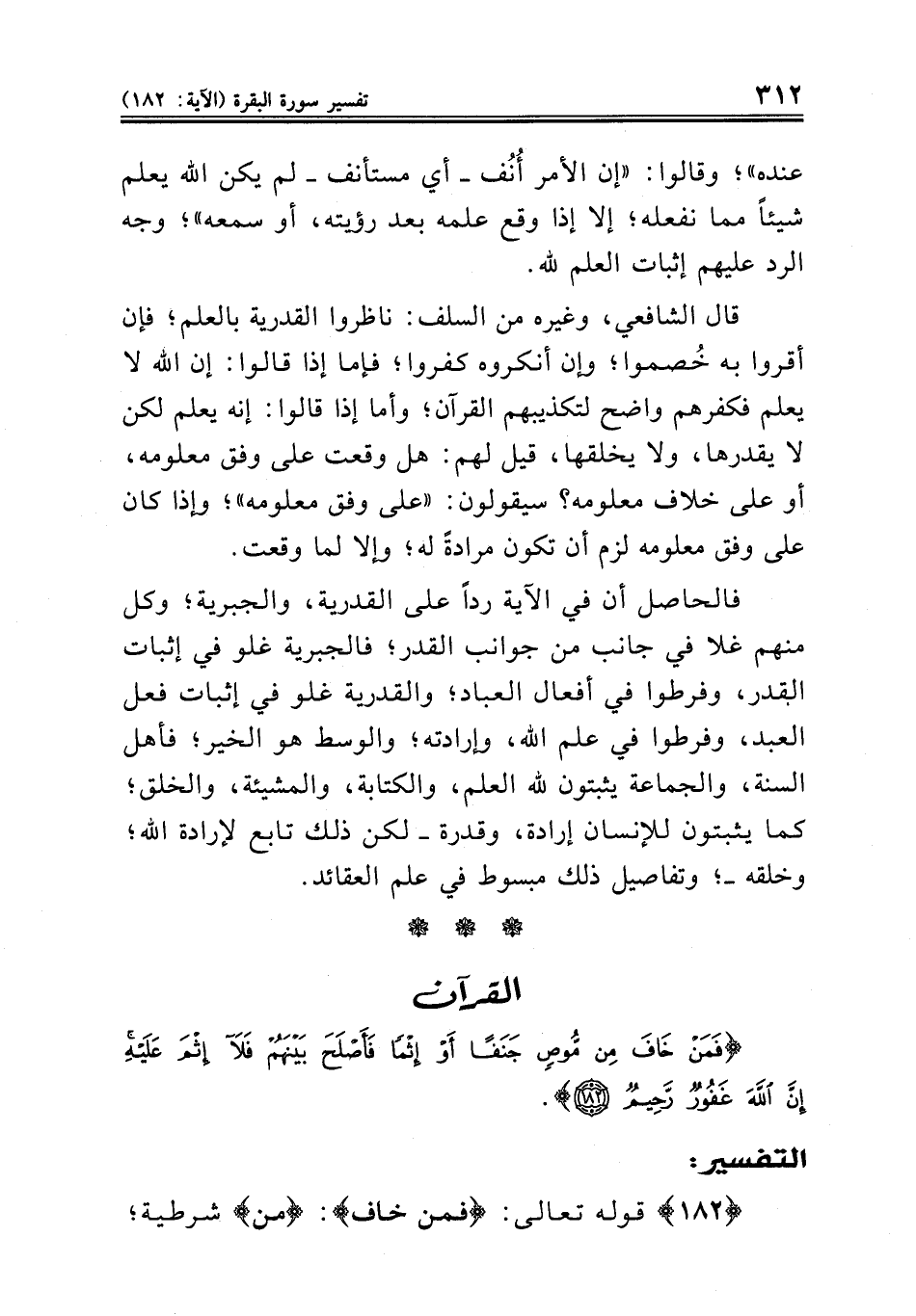 فالحاصل أن في الآية رداً على القدرية، والجبرية؛ وكل منهم غلا في جانب من جوانب القدر؛ فالجبرية غلو في إثبات القدر، وفرطوا في أفعال العباد؛ والقدرية غلو في إثبات فعل العبد، وفرطوا في علم الله، وإرادته؛ والوسط هو الخير؛ فأهل السنة، والجماعة يثبتون لله العلم، والكتابة، والمشيئة، والخلق؛ كما يثبتون للإنسان إرادة، وقدرة ــ لكن ذلك تابع لإرادة الله؛ وخلقه ــ؛ وتفاصيل ذلك مبسوط في علم العقائد.