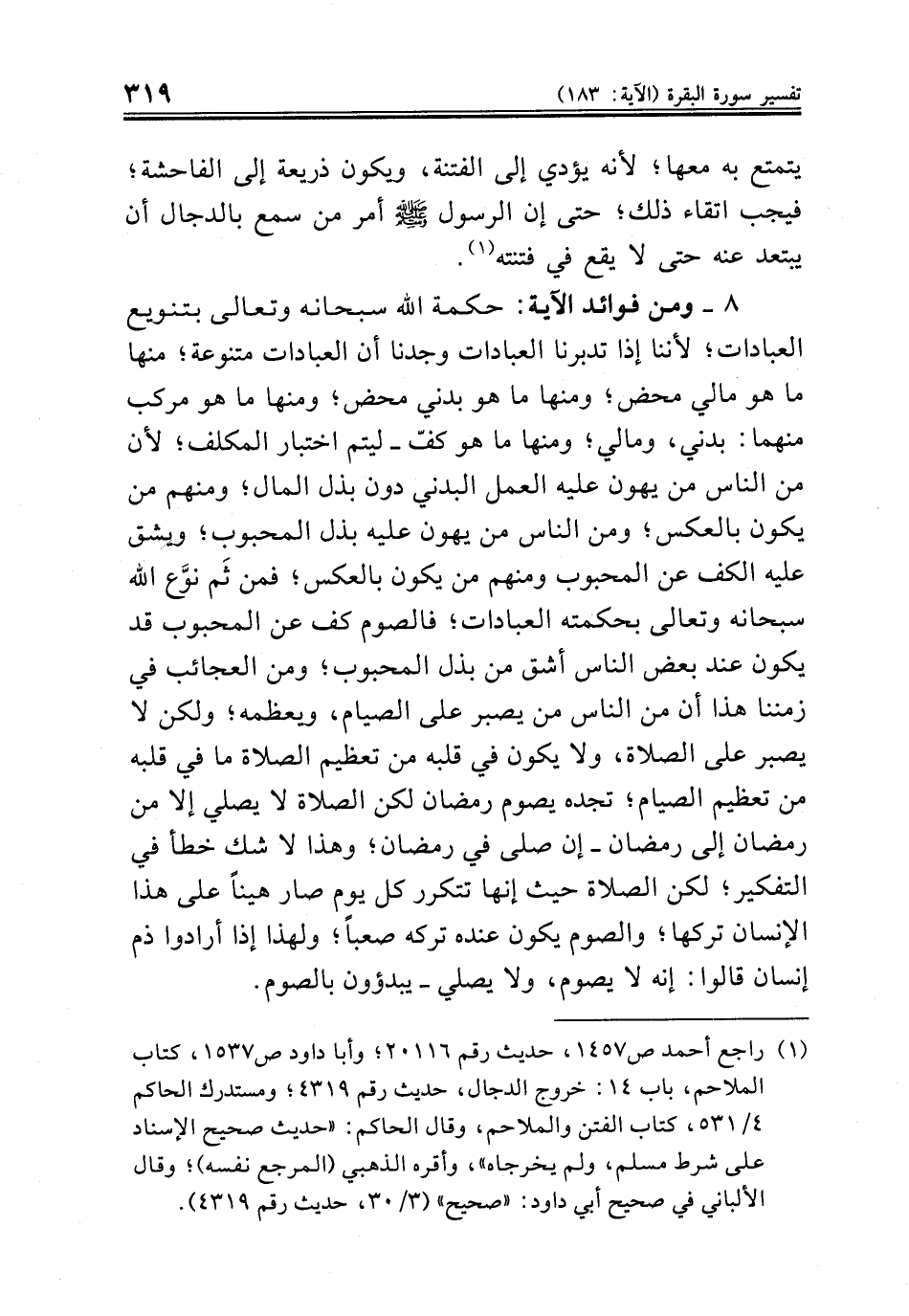 ٨ - ومن فوائد الآية: حكمة الله سبحانه وتعالى بتنويع العبادات؛ لأننا إذا تدبرنا العبادات وجدنا أن العبادات متنوعة؛ منها ما هو مالي محض؛ ومنها ما هو بدني محض؛ ومنها ما هو مركب منهما: بدني، ومالي؛ ومنها ما هو كفّ ــ ليتم اختبار المكلف؛ لأن من الناس من يهون عليه العمل البدني دون بذل المال؛ ومنهم من يكون بالعكس؛ ومن الناس من يهون عليه بذل المحبوب؛ ويشق عليه الكف عن المحبوب ومنهم من يكون بالعكس؛ فمن ثَم نوَّع الله سبحانه وتعالى بحكمته العبادات؛ فالصوم كف عن المحبوب قد يكون عند بعض الناس أشق من بذل المحبوب؛ ومن العجائب في زمننا هذا أن من الناس من يصبر على الصيام، ويعظمه؛ ولكن لا يصبر على الصلاة، ولا يكون في قلبه من تعظيم الصلاة ما في قلبه من تعظيم الصيام؛ تجده يصوم رمضان لكن الصلاة لا يصلي إلا من رمضان إلى رمضان ــ إن صلى في رمضان؛ وهذا لا شك خطأ في التفكير؛ لكن الصلاة حيث إنها تتكرر كل يوم صار هيناً على هذا الإنسان تركها؛ والصوم يكون عنده تركه صعباً؛ ولهذا إذا أرادوا ذم إنسان قالوا: إنه لا يصوم، ولا يصلي ــ يبدؤون بالصوم.