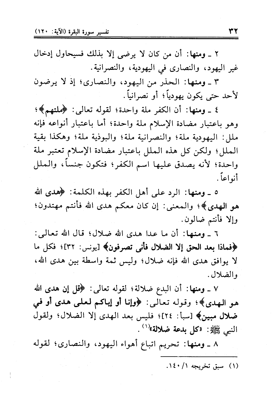 ٣ ــ ومنها: الحذر من اليهود، والنصارى؛ إذ لا يرضون لأحد حتى يكون يهودياً؛ أو نصرانياً.