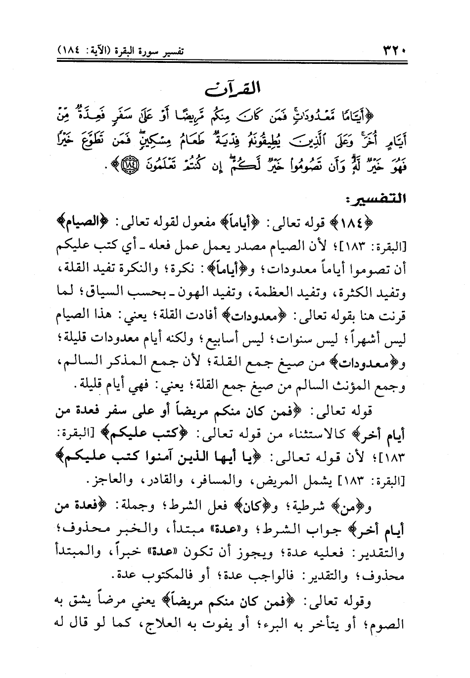{١٨٤} قوله تعالى: {أياماً} مفعول لقوله تعالى: {الصيام} [البقرة: ١٨٣]؛ لأن الصيام مصدر يعمل عمل فعله ــ أي كتب عليكم أن تصوموا أياماً معدودات؛ و {أياماً}: نكرة؛ والنكرة تفيد القلة، وتفيد الكثرة، وتفيد العظمة، وتفيد الهون ــ بحسب السياق؛ لما قرنت هنا بقوله تعالى: {معدودات} أفادت القلة؛ يعني: هذا الصيام ليس أشهراً؛ ليس سنوات؛ ليس أسابيع؛ ولكنه أيام معدودات قليلة؛ و {معدودات} من صيغ جمع القلة؛ لأن جمع المذكر السالم، وجمع المؤنث السالم من صيغ جمع القلة؛ يعني: فهي أيام قليلة.