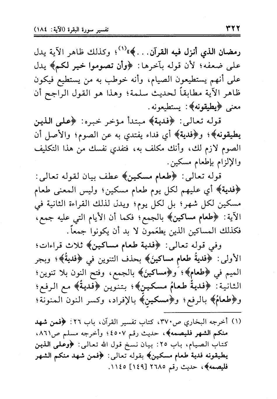 (¬١) أخرجه البخاري ص ٣٧٠، كتاب تفسير القرآن، باب ٢٦: (فمن شهد منكم الشهر فليصمه)، حديث رقم ٤٥٠٧؛ وأخرجه مسلم ص ٨٦١، كتاب الصيام، باب ٢٥: بيان نسخ قول الله تعالى: (وعلى الذين يطيقون فدية طعام مسكين) بقوله تعالى: (فمن شهد منكم الشخر فليصمه)، حديث رقم ٢٦٨٥ [١٤٩] ١١٤٥.