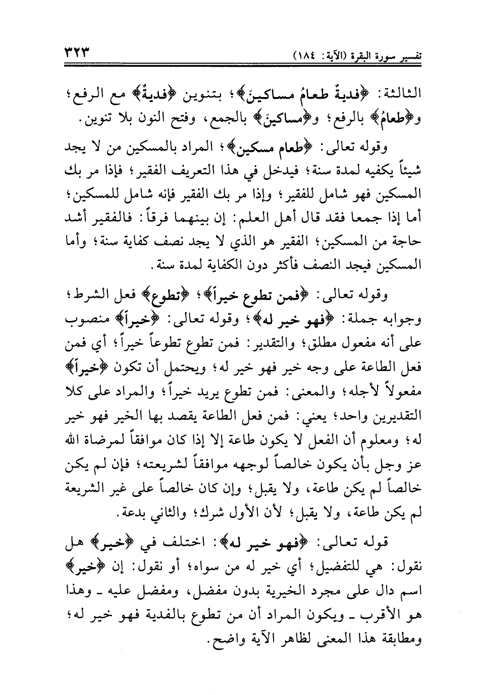 وقوله تعالى: {فمن تطوع خيراً}؛ {تطوع} فعل الشرط؛ وجوابه جملة: {فهو خير له}؛ وقوله تعالى: {خيراً} منصوب على أنه مفعول مطلق؛ والتقدير: فمن تطوع تطوعاً خيراً؛ أي فمن فعل الطاعة على وجه خير فهو خير له؛ ويحتمل أن تكون {خيراً} مفعولاً لأجله؛ والمعنى: فمن تطوع يريد خيراً؛ والمراد على كلا التقديرين واحد؛ يعني: فمن فعل الطاعة يقصد بها الخير فهو خير له؛ ومعلوم أن الفعل لا يكون طاعة إلا إذا كان موافقاً لمرضاة الله عز وجل بأن يكون خالصاً لوجهه موافقاً لشريعته؛ فإن لم يكن خالصاً لم يكن طاعة، ولا يقبل؛ وإن كان خالصاً على غير الشريعة لم يكن طاعة، ولا يقبل؛ لأن الأول شرك؛ والثاني بدعة.