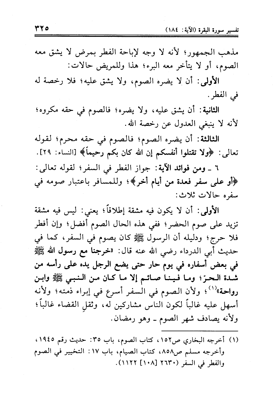الأولى: أن لا يكون فيه مشقة إطلاقاً؛ يعني: ليس فيه مشقة تزيد على صوم الحضر؛ ففي هذه الحال الصوم أفضل؛ وإن أفطر فلا حرج؛ ودليله أن الرسول صلى الله عليه وسلم كان يصوم في السفر، كما في حديث أبي الدرداء رضي الله عنه قال: «خرجنا مع رسول الله صلى الله عليه وسلم في بعض أسفاره في يوم حار حتى يضع الرجل يده على رأسه من شدة الحرّ؛ وما فينا صائم إلا ما كان من النبي صلى الله عليه وسلم وابن رواحة» (¬١)؛ ولأن الصوم في السفر أسرع في إبراء ذمته؛ ولأنه أسهل عليه غالباً لكون الناس مشاركين له، وثقلِ القضاء غالباً؛ ولأنه يصادف شهر الصوم - وهو رمضان.