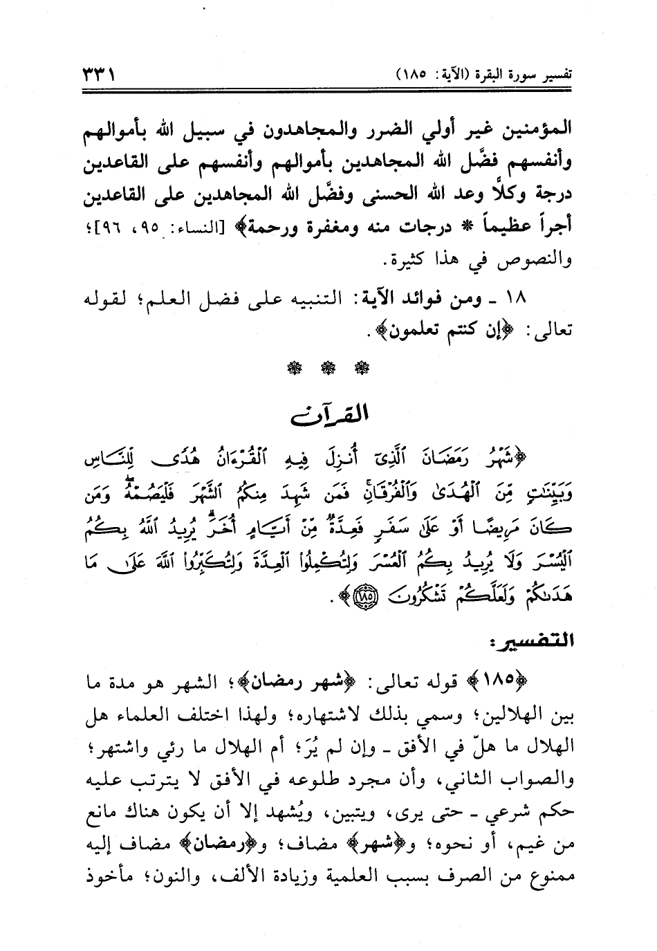 {١٨٥} قوله تعالى: {شهر رمضان}؛ الشهر هو مدة ما بين الهلالين؛ وسمي بذلك لاشتهاره؛ ولهذا اختلف العلماء هل الهلال ما هلّ في الأفق - وإن لم يُرَ؛ أم الهلال ما رئي واشتهر؛ والصواب الثاني، وأن مجرد طلوعه في الأفق لا يترتب عليه حكم شرعي - حتى يرى، ويتبين، ويُشهد إلا أن يكون هناك مانع من غيم، أو نحوه؛ و {شهر} مضاف؛ و {رمضان} مضاف إليه ممنوع من الصرف بسبب العلمية وزيادة الألف، والنون؛ مأخوذ