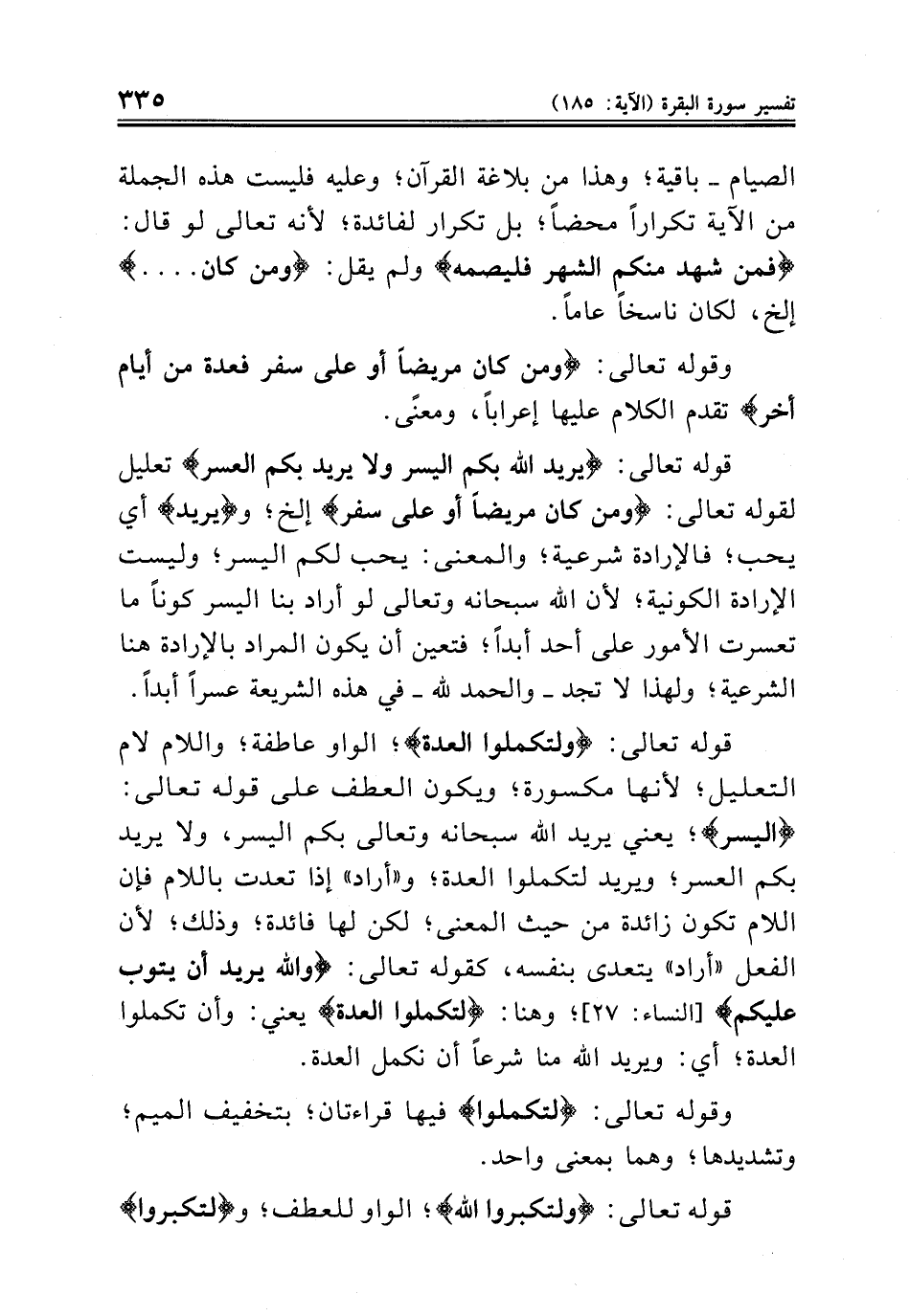 قوله تعالى: {يريد الله بكم اليسر ولا يريد بكم العسر} تعليل لقوله تعالى: {ومن كان مريضاً أو على سفر} إلخ؛ و {يريد} أي يحب؛ فالإرادة شرعية؛ والمعنى: يحب لكم اليسر؛ وليست الإرادة الكونية؛ لأن الله سبحانه وتعالى لو أراد بنا اليسر كوناً ما تعسرت الأمور على أحد أبداً؛ فتعين أن يكون المراد بالإرادة هنا الشرعية؛ ولهذا لا تجد - والحمد لله - في هذه الشريعة عسراً أبداً.