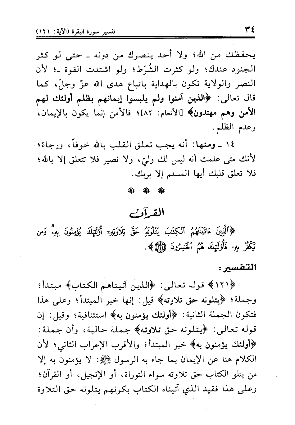 {١٢١} قوله تعالى: {الذين آتيناهم الكتاب} مبتدأ؛ وجملة؛ {يتلونه حق تلاوته} قيل: إنها خبر المبتدأ؛ وعلى هذا فتكون الجملة الثانية: {أولئك يؤمنون به} استئنافية؛ وقيل: إن قوله تعالى: {يتلونه حق تلاوته} جملة حالية، وأن جملة: {أولئك يؤمنون به} خبر المبتدأ؛ والأقرب الإعراب الثاني؛ لأن الكلام هنا عن الإيمان بما جاء به الرسول صلى الله عليه وسلم: لا يؤمنون به إلا من يتلو الكتاب حق تلاوته سواء التوراة، أو الإنجيل، أو القرآن؛ وعلى هذا فقيد الذي آتيناه الكتاب بكونهم يتلونه حق التلاوة