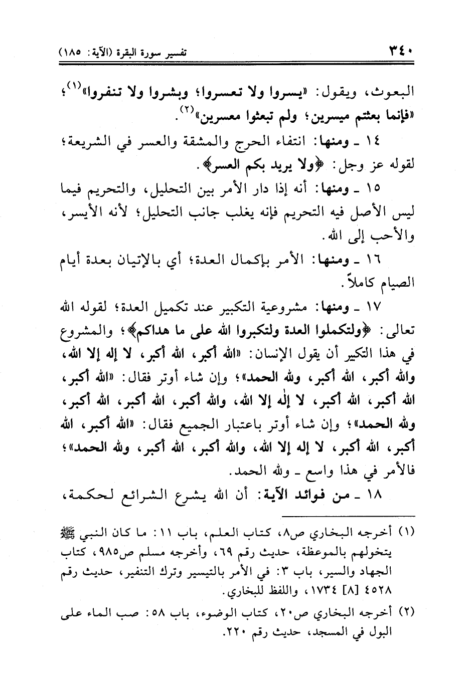 ١٧ ــ ومنها: مشروعية التكبير عند تكميل العدة؛ لقول الله تعالى: {ولتكملوا العدة ولتكبروا الله على ما هداكم}؛ والمشروع في هذا التكبير أن يقول الإنسان: «الله أكبر، الله أكبر، لا إله إلا الله، والله أكبر، الله أكبر، ولله الحمد»؛ وإن شاء أوتر فقال: «الله أكبر، الله أكبر، الله أكبر، لا إله إلا الله، والله أكبر، الله أكبر، الله أكبر، ولله الحمد»؛ وإن شاء أوتر باعتبار الجميع فقال: «الله أكبر، الله أكبر، الله أكبر، لا إله إلا الله، والله أكبر، الله أكبر، ولله الحمد»؛ فالأمر في هذا واسع - ولله الحمد.