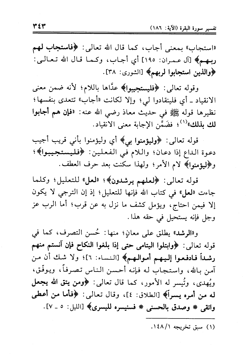 وقوله تعالى: {فليستجيبوا} عدَّاها باللام؛ لأنه ضمن معنى الانقياد - أي فلينقادوا لي؛ وإلا لكانت «أجاب» تتعدى بنفسها؛ نظيرها قوله صلى الله عليه وسلم في حديث معاذ رضي الله عنه: «فإن هم أجابوا لك بذلك» (¬١)؛ فضَمَّن الإجابة معنى الانقياد.