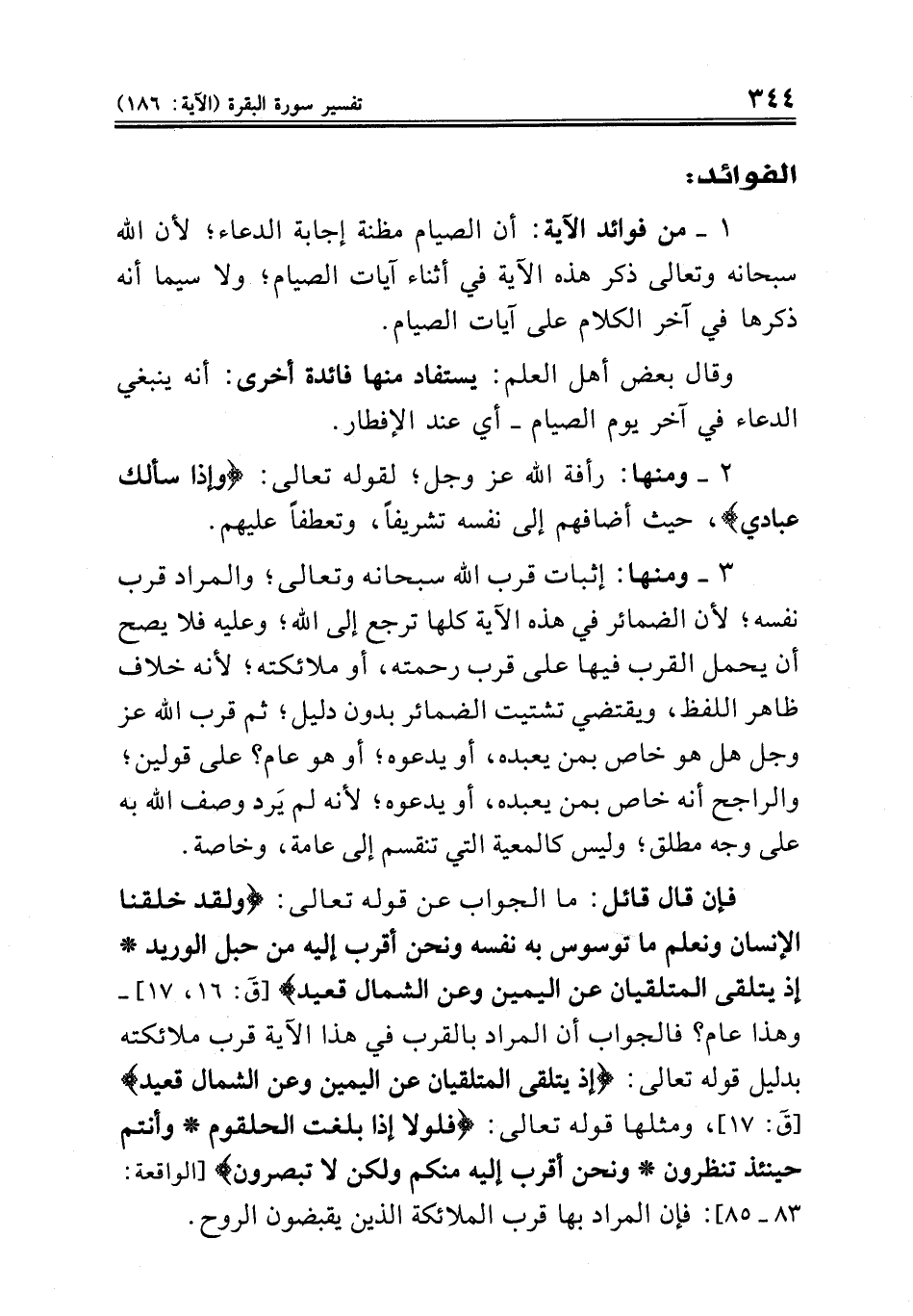 ٣ ــ ومنها: إثبات قرب الله سبحانه وتعالى؛ والمراد قرب نفسه؛ لأن الضمائر في هذه الآية كلها ترجع إلى الله؛ وعليه فلا يصح أن يحمل القرب فيها على قرب رحمته، أو ملائكته؛ لأنه خلاف ظاهر اللفظ، ويقتضي تشتيت الضمائر بدون دليل؛ ثم قرب الله عز وجل هل هو خاص بمن يعبده، أو يدعوه؛ أو هو عام؟ على قولين؛ والراجح أنه خاص بمن يعبده، أو يدعوه؛ لأنه لم يَرد وصف الله به على وجه مطلق؛ وليس كالمعية التي تنقسم إلى عامة، وخاصة.