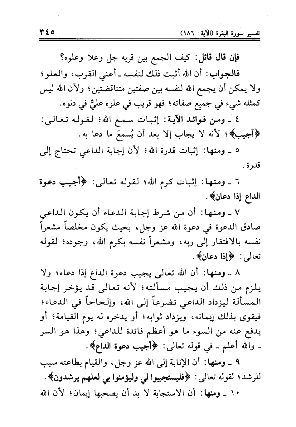 ٨ - ومنها: أن الله تعالى يجيب دعوة الداع إذا دعاه؛ ولا يلزم من ذلك أن يجيب مسألته؛ لأنه تعالى قد يؤخر إجابة المسألة ليزداد الداعي تضرعاً إلى الله، وإلحاحاً في الدعاء؛ فيقوى بذلك إيمانه، ويزداد ثوابه؛ أو يدخره له يوم القيامة؛ أو يدفع عنه من السوء ما هو أعظم فائدة للداعي؛ وهذا هو السر - والله أعلم - في قوله تعالى: {أجيب دعوة الداع}.
