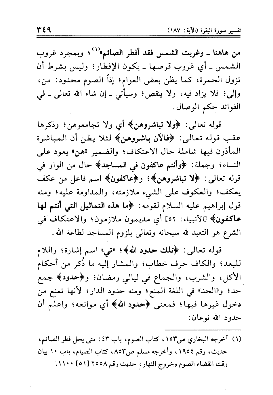 من هاهنا - وغربت الشمس فقد أفطر الصائم» (¬١)؛ وبمجرد غروب الشمس - أي غروب قرصها - يكون الإفطار؛ وليس بشرط أن تزول الحمرة، كما يظن بعض العوام؛ إذاً الصوم محدود: من، وإلى؛ فلا يزاد فيه، ولا ينقص؛ وسيأتي إن شاء الله تعالى - في الفوائد حكم الوصال.