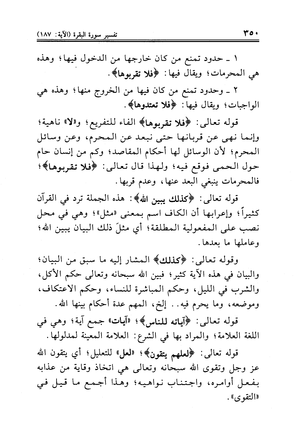 وقوله تعالى: {كذلك} المشار إليه ما سبق من البيان؛ والبيان في هذه الآية كثير؛ فبين الله سبحانه وتعالى حكم الأكل، والشرب في الليل، وحكم المباشرة للنساء، وحكم الاعتكاف، وموضعه، وما يحرم فيه .. إلخ، المهم عدة أحكام بينها الله.