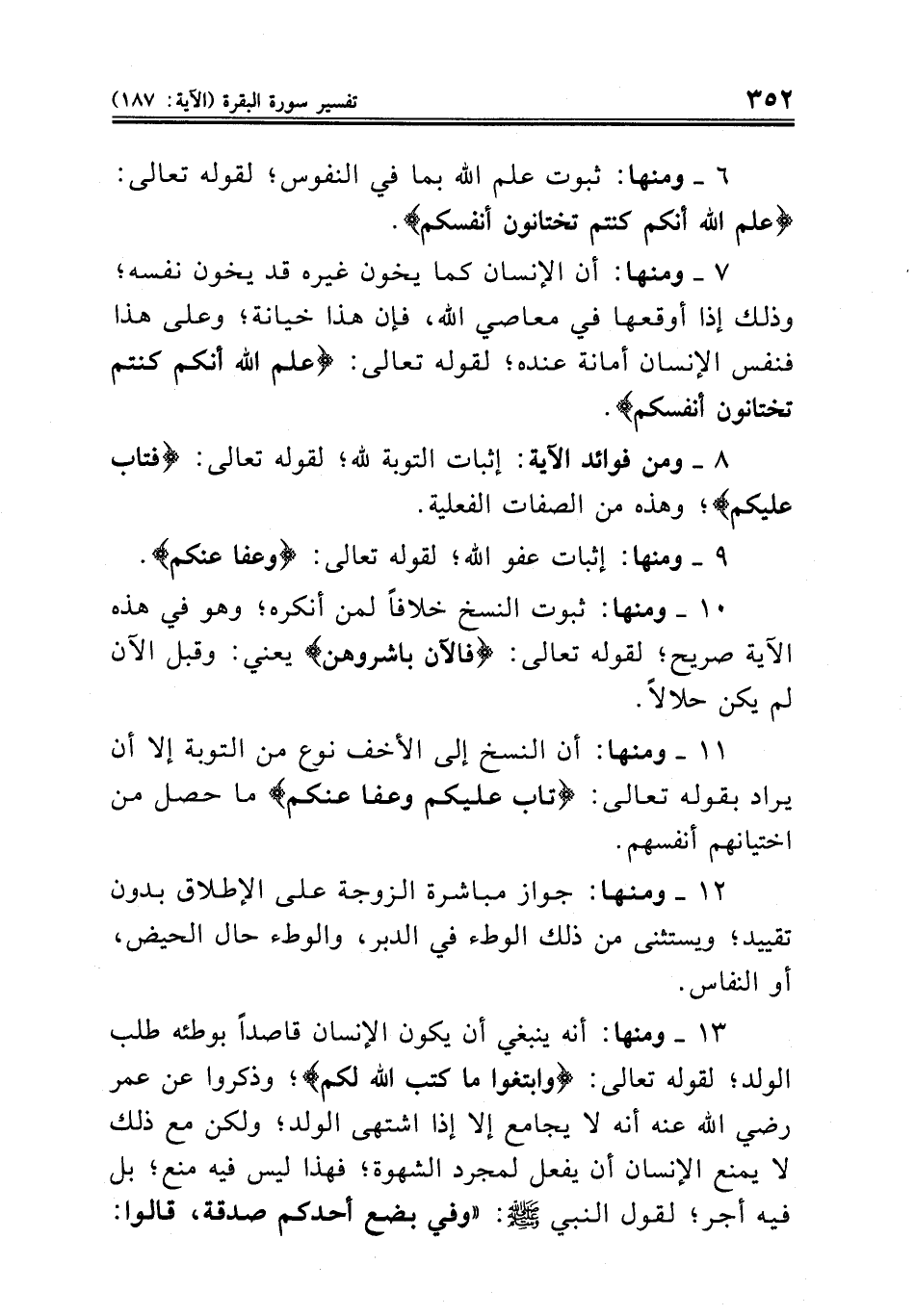 ١٠ ــ ومنها: ثبوت النسخ خلافاً لمن أنكره؛ وهو في هذه الآية صريح؛ لقوله تعالى: {فالآن باشروهن} يعني: وقبل الآن لم يكن حلالاً.