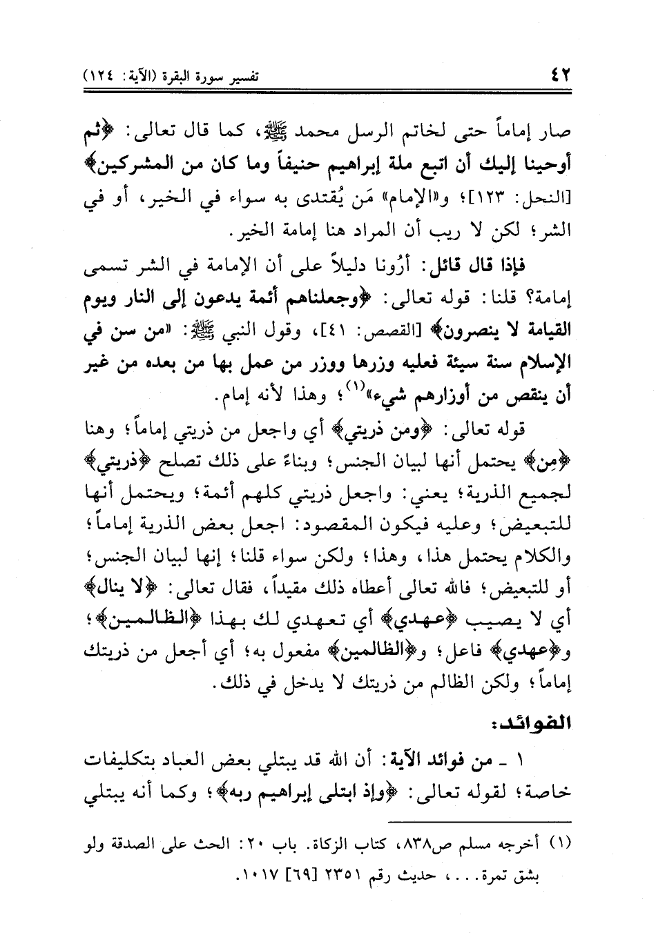 فإذا قال قائل: أرُونا دليلاً على أن الإمامة في الشر تسمى إمامة؟ قلنا: قوله تعالى: {وجعلناهم أئمة يدعون إلى النار ويوم القيامة لا ينصرون} [القصص: ٤١]، وقول النبي صلى الله عليه وسلم: «من سن في الإسلام سنة سيئة فعليه وزرها ووزر من عمل بها من بعده من غير أن ينقص من أوزارهم شيء» (¬١)؛ وهذا لأنه إمام.