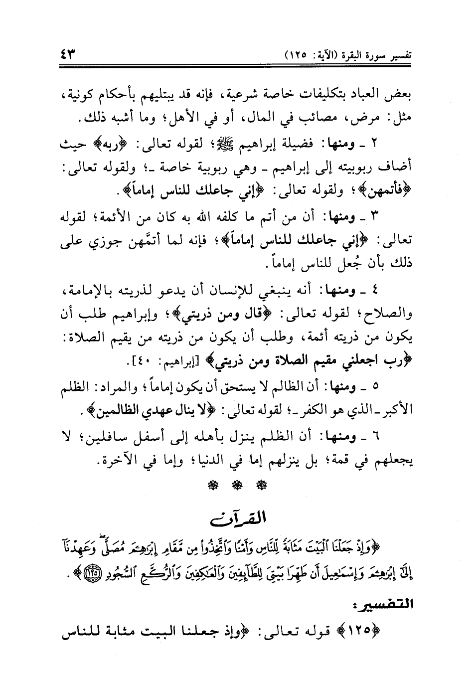 ٣ ــ ومنها: أن من أتم ما كلفه الله به كان من الأئمة؛ لقوله تعالى: {إني جاعلك للناس إماماً}؛ فإنه لما أتمَّهن جوزي على ذلك بأن جُعل للناس إماماً.