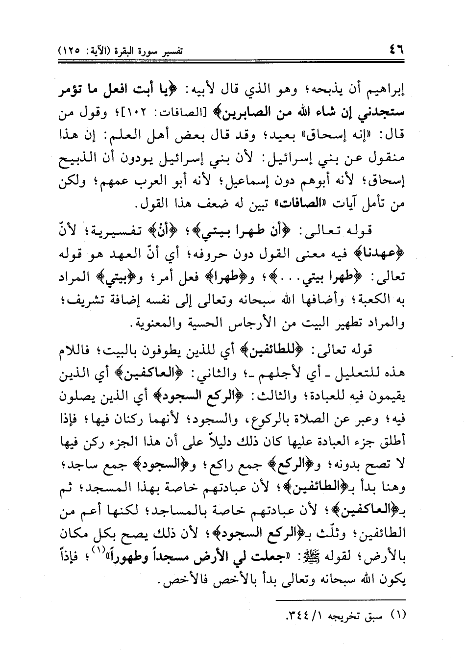 قوله تعالى: {للطائفين} أي للذين يطوفون بالبيت؛ فاللام هذه للتعليل ــ أي لأجلهم ــ؛ والثاني: {العاكفين} أي الذين يقيمون فيه للعبادة؛ والثالث: {الركع السجود} أي الذين يصلون فيه؛ وعبر عن الصلاة بالركوع، والسجود؛ لأنهما ركنان فيها؛ فإذا أطلق جزء العبادة عليها كان ذلك دليلاً على أن هذا الجزء ركن فيها لا تصح بدونه؛ و {الركع} جمع راكع؛ و {السجود} جمع ساجد؛ وهنا بدأ بـ {الطائفين}؛ لأن عبادتهم خاصة بهذا المسجد؛ ثم بـ {العاكفين}؛ لأن عبادتهم خاصة بالمساجد؛ لكنها أعم من الطائفين؛ وثلّث بـ {الركع السجود}؛ لأن ذلك يصح بكل مكان بالأرض؛ لقوله صلى الله عليه وسلم: «جعلت لي الأرض مسجداً وطهوراً» (¬١)؛ فإذاً يكون الله سبحانه وتعالى بدأ بالأخص فالأخص.
