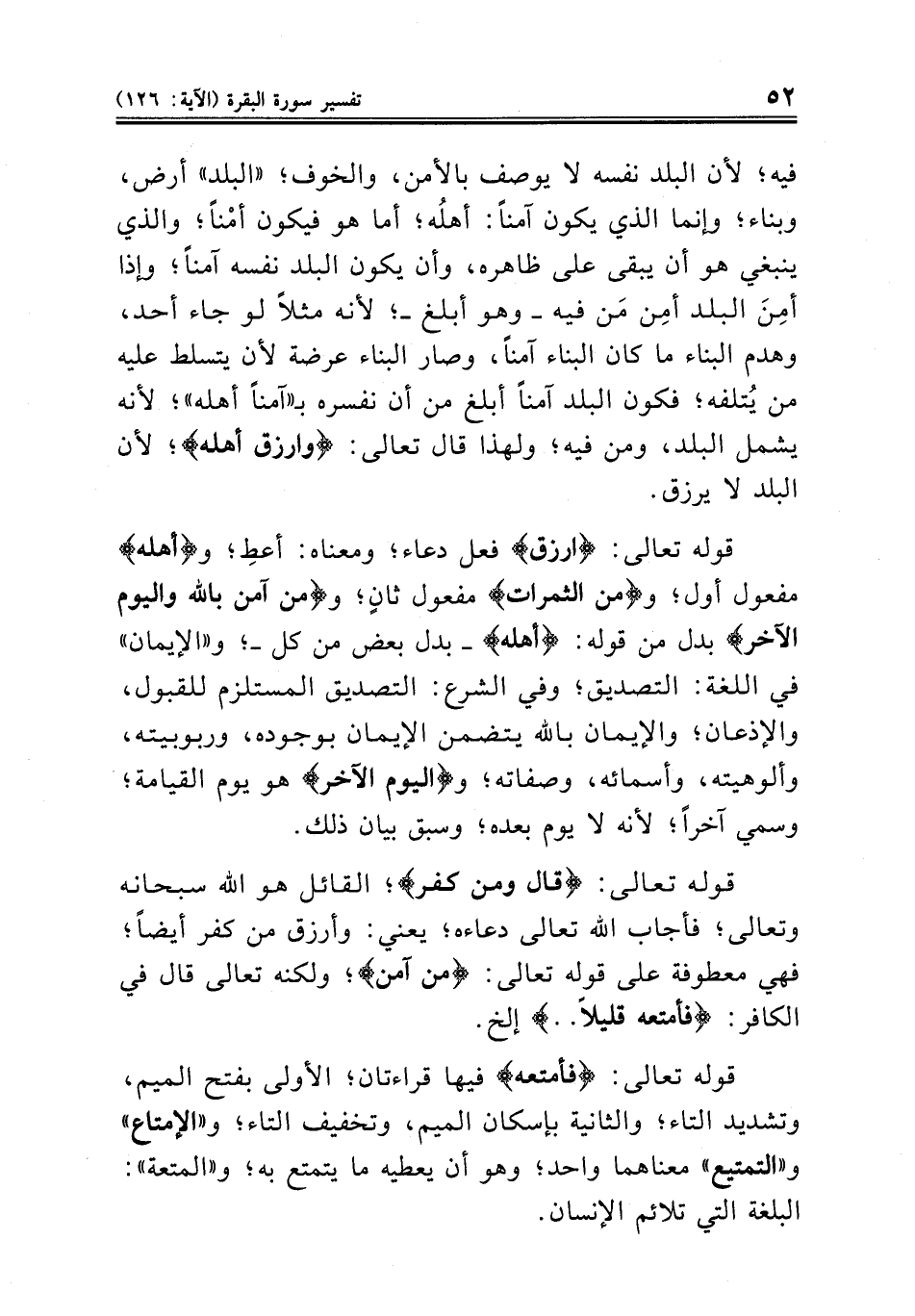 قوله تعالى: {ارزق} فعل دعاء؛ ومعناه: أعطِ؛ و {أهله} مفعول أول؛ و {من الثمرات} مفعول ثانٍ؛ و {من آمن بالله واليوم الآخر} بدل من قوله: {أهله} ــ بدل بعض من كل ــ؛ و «الإيمان» في اللغة: التصديق؛ وفي الشرع: التصديق المستلزم للقبول، والإذعان؛ والإيمان بالله يتضمن الإيمان بوجوده، وربوبيته، وألوهيته، وأسمائه، وصفاته؛ و {اليوم الآخر} هو يوم القيامة؛ وسمي آخراً؛ لأنه لا يوم بعده؛ وسبق بيان ذلك.