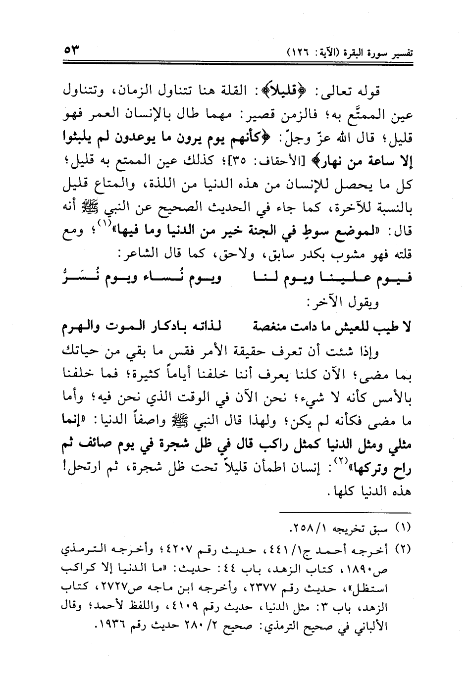 وإذا شئت أن تعرف حقيقة الأمر فقس ما بقي من حياتك بما مضى؛ الآن كلنا يعرف أننا خلفنا أياماً كثيرة؛ فما خلفنا بالأمس كأنه لا شيء؛ نحن الآن في الوقت الذي نحن فيه؛ وأما ما مضى فكأنه لم يكن؛ ولهذا قال النبي صلى الله عليه وسلم واصفاً الدنيا: «إنما مثلي ومثل الدنيا كمثل راكب قال في ظل شجرة في يوم صائف ثم راح وتركها» (¬٢): إنسان اطمأن قليلاً تحت ظل شجرة، ثم ارتحل! هذه الدنيا كلها.