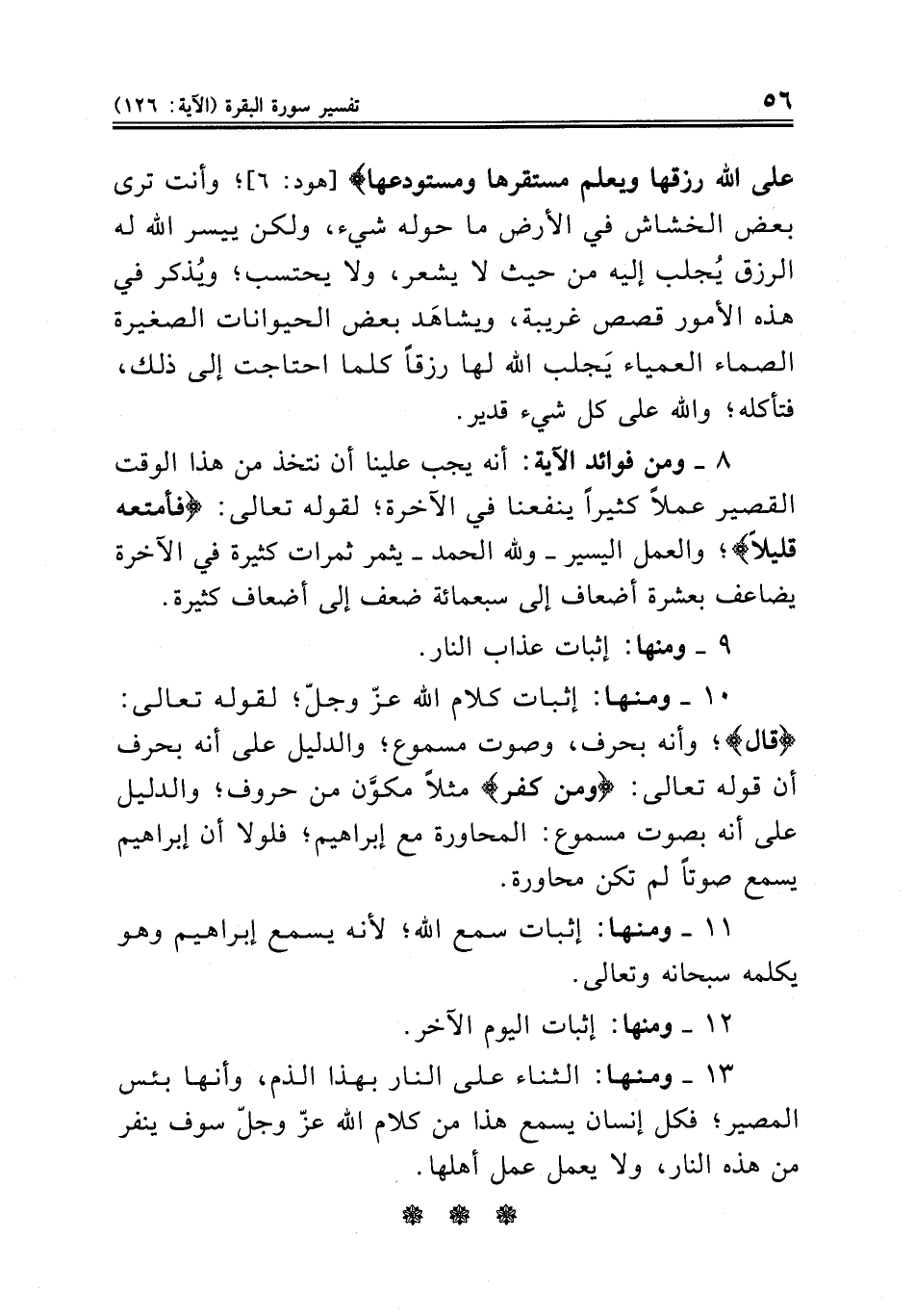 ١٠ ــ ومنها: إثبات كلام الله عزّ وجلّ؛ لقوله تعالى: {قال}؛ وأنه بحرف، وصوت مسموع؛ والدليل على أنه بحرف أن قوله تعالى: {ومن كفر} مثلاً مكوَّن من حروف؛ والدليل على أنه بصوت مسموع: المحاورة مع إبراهيم؛ فلولا أن إبراهيم يسمع صوتاً لم تكن محاورة.
