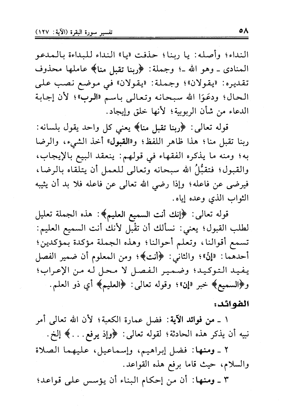 ١ ــ من فوائد الآية: فضل عمارة الكعبة؛ لأن الله تعالى أمر نبيه أن يذكر هذه الحادثة؛ لقوله تعالى: {وإذ يرفع ... } إلخ.