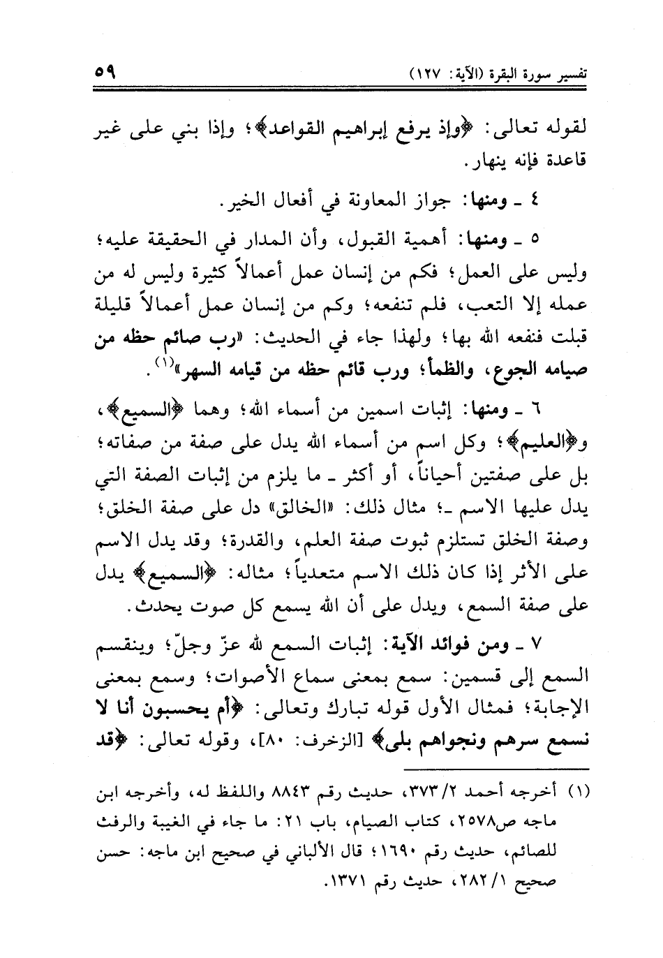 ٦ ــ ومنها: إثبات اسمين من أسماء الله؛ وهما {السميع}، و {العليم}؛ وكل اسم من أسماء الله يدل على صفة من صفاته؛ بل على صفتين أحياناً، أو أكثر ــ ما يلزم من إثبات الصفة التي يدل عليها الاسم ــ؛ مثال ذلك: «الخالق» دل على صفة الخلق؛ وصفة الخلق تستلزم ثبوت صفة العلم، والقدرة؛ وقد يدل الاسم على الأثر إذا كان ذلك الاسم متعدياً؛ مثاله: {السميع} يدل على صفة السمع، ويدل على أن الله يسمع كل صوت يحدث.