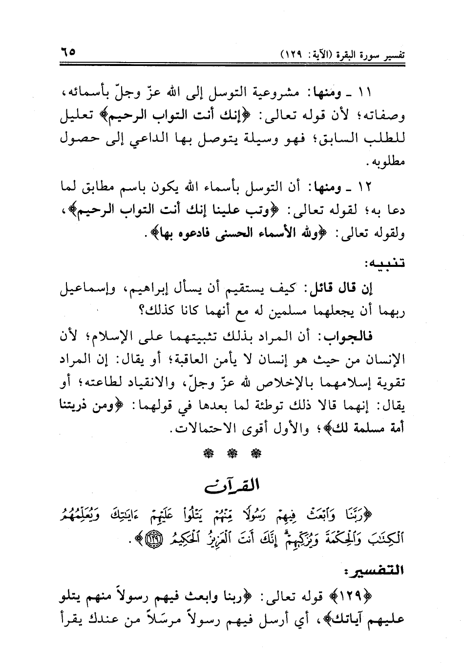١١ ــ ومنها: مشروعية التوسل إلى الله عزّ وجلّ بأسمائه، وصفاته؛ لأن قوله تعالى: {إنك أنت التواب الرحيم} تعليل للطلب السابق؛ فهو وسيلة يتوصل بها الداعي إلى حصول مطلوبه.