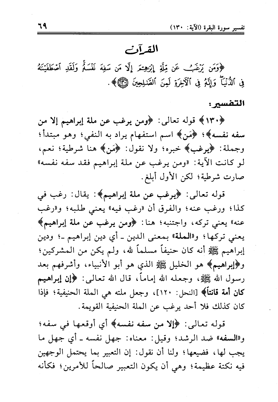 {١٣٠} قوله تعالى: {ومن يرغب عن ملة إبراهيم إلا من سفه نفسه}؛ {مَن} اسم استفهام يراد به النفي؛ وهو مبتدأ؛ وجملة: {يرغب} خبره؛ ولا نقول: {مَن} هنا شرطية؛ نعم، لو كانت الآية: «ومن يرغب عن ملة إبراهيم فقد سفه نفسه» صارت شرطية؛ لكن الأول أبلغ.