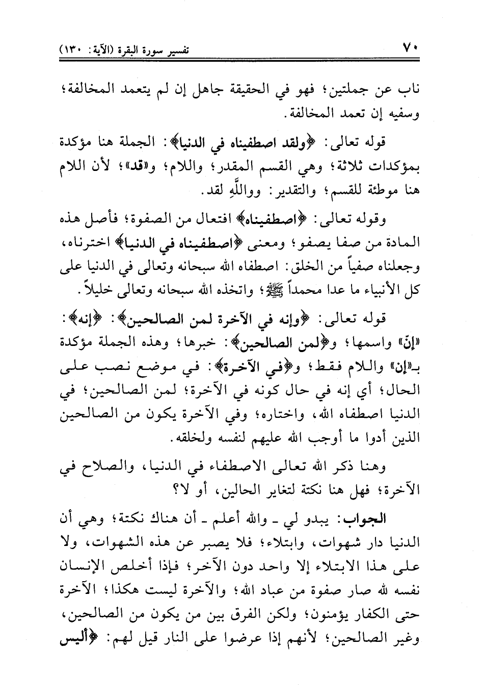 قوله تعالى: {وإنه في الآخرة لمن الصالحين}: {إنه}: «إنّ» واسمها؛ و {لمن الصالحين}: خبرها؛ وهذه الجملة مؤكدة بـ «إن» واللام فقط؛ و {في الآخرة}: في موضع نصب على الحال؛ أي إنه في حال كونه في الآخرة؛ لمن الصالحين؛ في الدنيا اصطفاه الله، واختاره؛ وفي الآخرة يكون من الصالحين الذين أدوا ما أوجب الله عليهم لنفسه ولخلقه.
