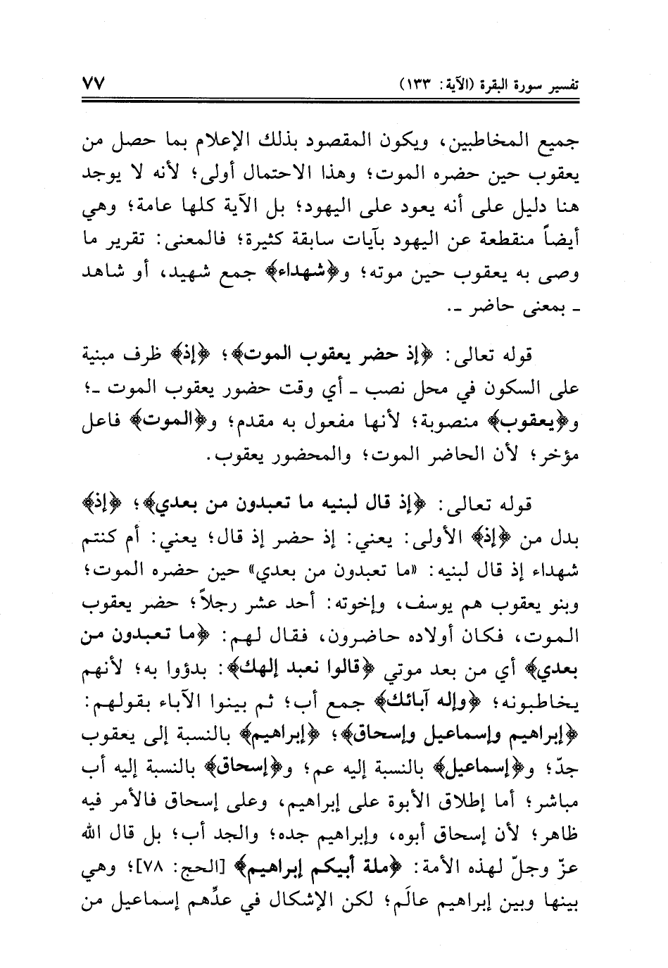 قوله تعالى: {إذ قال لبنيه ما تعبدون من بعدي}؛ {إذ} بدل من {إذ} الأولى: يعني: إذ حضر إذ قال؛ يعني: أم كنتم شهداء إذ قال لبنيه: «ما تعبدون من بعدي» حين حضره الموت؛ وبنو يعقوب هم يوسف، وإخوته: أحد عشر رجلاً؛ حضر يعقوب الموت، فكان أولاده حاضرون، فقال لهم: {ما تعبدون من بعدي} أي من بعد موتي {قالوا نعبد إلهك}: بدؤوا به؛ لأنهم يخاطبونه؛ {وإله آبائك} جمع أب؛ ثم بينوا الآباء بقولهم: {إبراهيم وإسماعيل وإسحاق}؛ {إبراهيم} بالنسبة إلى يعقوب جدّ؛ و {إسماعيل} بالنسبة إليه عم؛ و {إسحاق بالنسبة إليه أب مباشر؛ أما إطلاق الأبوة على إبراهيم، وعلى إسحاق فالأمر فيه ظاهر؛ لأن إسحاق أبوه، وإبراهيم جده؛ والجد أب؛ بل قال الله عزّ وجلّ لهذه الأمة: {ملة أبيكم إبراهيم} [الحج: ٧٨]؛ وهي بينها وبين إبراهيم عالَم؛ لكن الإشكال في عدِّهم إسماعيل من