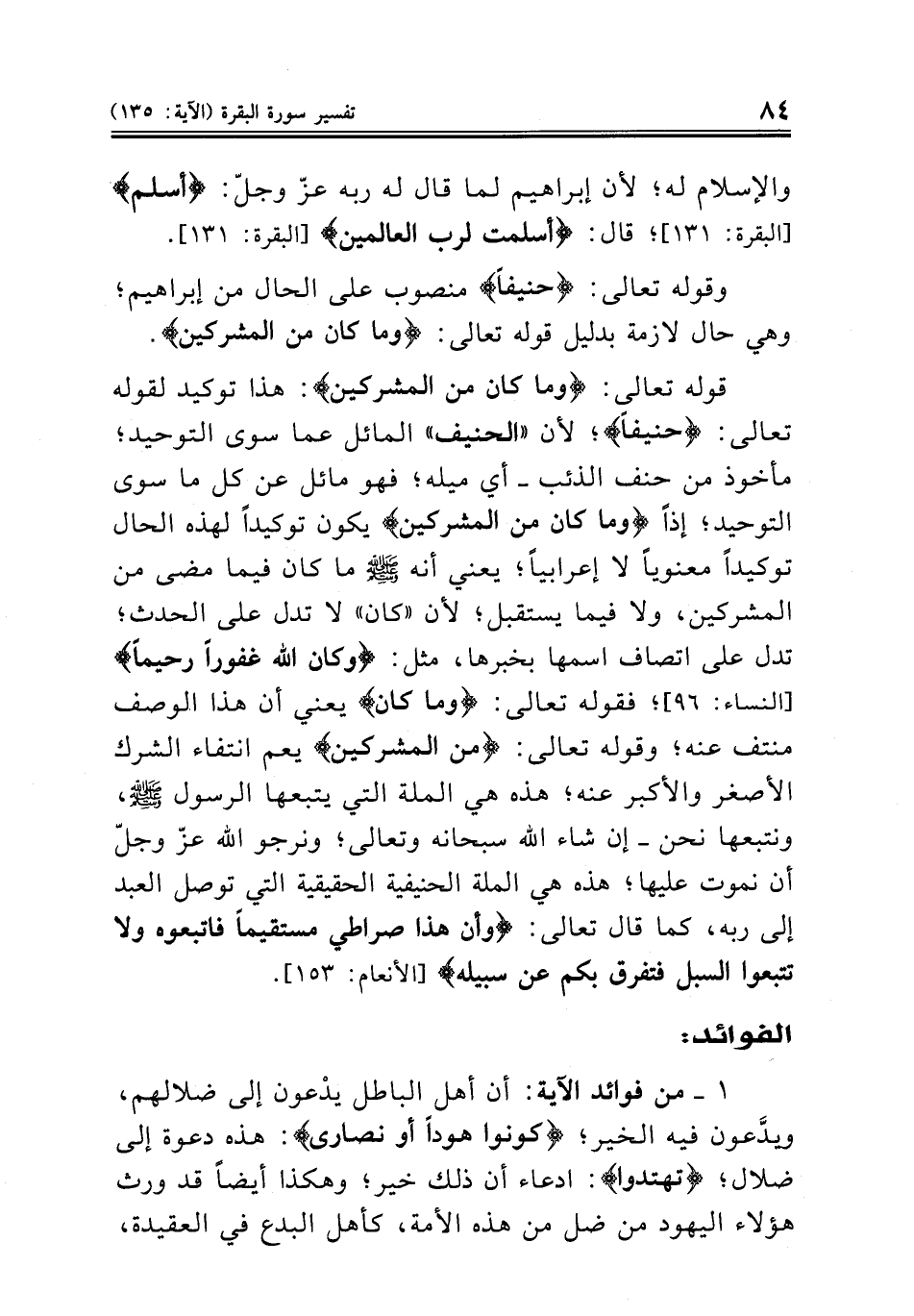 قوله تعالى: {وما كان من المشركين}: هذا توكيد لقوله تعالى: {حنيفاً}؛ لأن «الحنيف» المائل عما سوى التوحيد؛ مأخوذ من حنف الذئب ــ أي ميله؛ فهو مائل عن كل ما سوى التوحيد؛ إذاً {وما كان من المشركين} يكون توكيداً لهذه الحال توكيداً معنوياً لا إعرابياً؛ يعني أنه صلى الله عليه وسلم ما كان فيما مضى من المشركين، ولا فيما يستقبل؛ لأن «كان» لا تدل على الحدث؛ تدل على اتصاف اسمها بخبرها، مثل: {وكان الله غفوراً رحيماً} [النساء: ٩٦]؛ فقوله تعالى: {وما كان} يعني أن هذا الوصف منتف عنه؛ وقوله تعالى: {من المشركين} يعم انتفاء الشرك الأصغر والأكبر عنه؛ هذه هي الملة التي يتبعها الرسول صلى الله عليه وسلم، ونتبعها نحن ــ إن شاء الله سبحانه وتعالى؛ ونرجو الله عزّ وجلّ أن نموت عليها؛ هذه هي الملة الحنيفية الحقيقية التي توصل العبد إلى ربه، كما قال تعالى: {وأن هذا صراطي مستقيماً فاتبعوه ولا تتبعوا السبل فتفرق بكم عن سبيله} [الأنعام: ١٥٣].