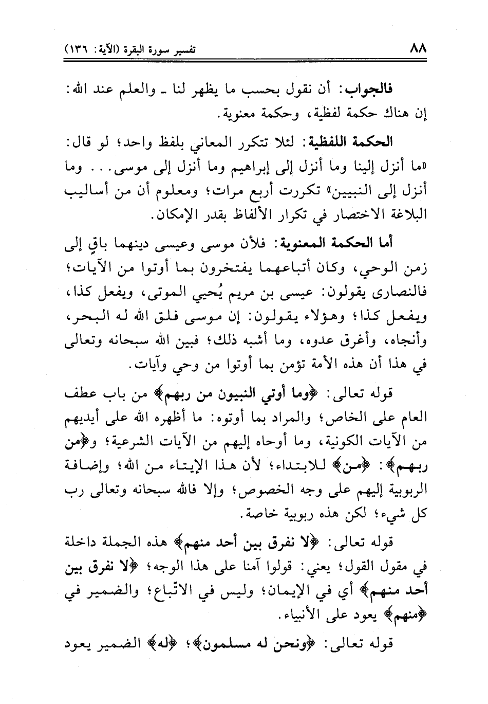 الحكمة اللفظية: لئلا تتكرر المعاني بلفظ واحد؛ لو قال: «ما أنزل إلينا وما أنزل إلى إبراهيم وما أنزل إلى موسى ... وما أنزل إلى النبيين» تكررت أربع مرات؛ ومعلوم أن من أساليب البلاغة الاختصار في تكرار الألفاظ بقدر الإمكان.