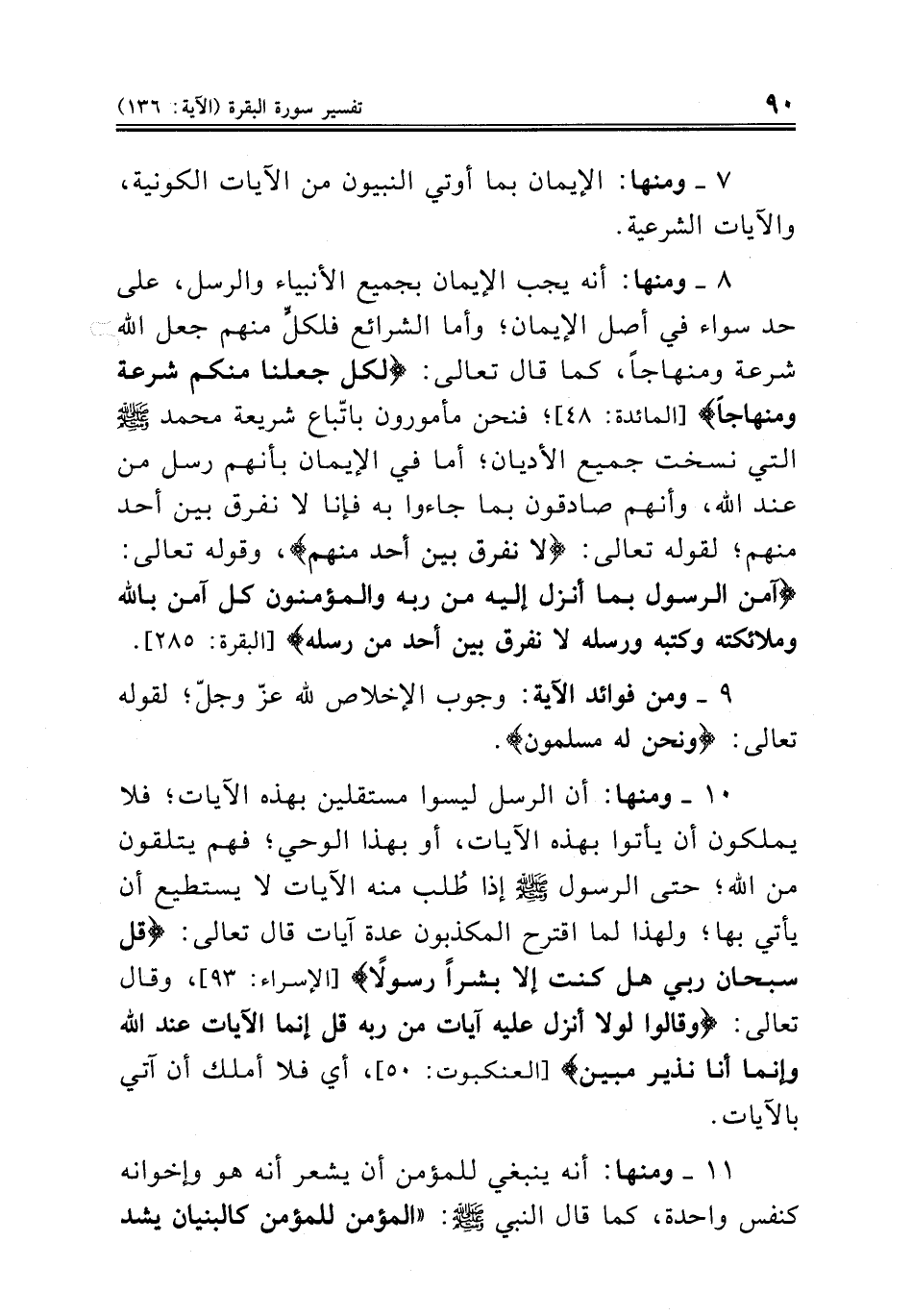 ٨ ــ ومنها: أنه يجب الإيمان بجميع الأنبياء والرسل، على حد سواء في أصل الإيمان؛ وأما الشرائع فلكلٍّ منهم جعل الله شرعة ومنهاجاً، كما قال تعالى: {لكل جعلنا منكم شرعة ومنهاجاً} [المائدة: ٤٨]؛ فنحن مأمورون باتّباع شريعة محمد صلى الله عليه وسلم التي نسخت جميع الأديان؛ أما في الإيمان بأنهم رسل من عند الله، وأنهم صادقون بما جاءوا به فإنا لا نفرق بين أحد منهم؛ لقوله تعالى: {لا نفرق بين أحد منهم}، وقوله تعالى: {آمن الرسول بما أنزل إليه من ربه والمؤمنون كل آمن بالله وملائكته وكتبه ورسله لا نفرق بين أحد من رسله} [البقرة: ٢٨٥].