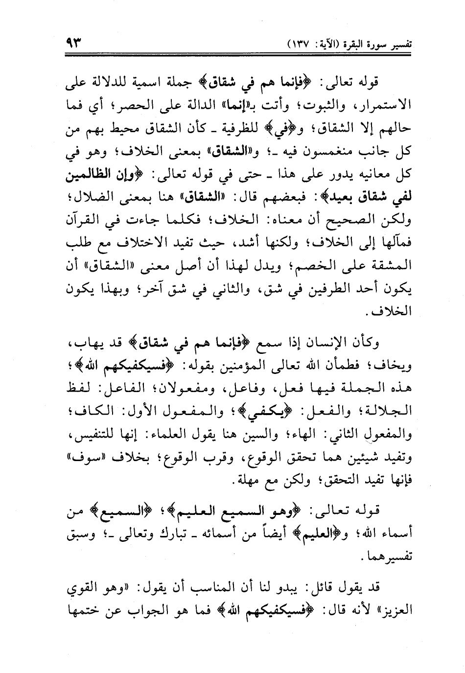 وكأن الإنسان إذا سمع {فإنما هم في شقاق} قد يهاب، ويخاف؛ فطمأن الله تعالى المؤمنين بقوله: {فسيكفيكهم الله}؛ هذه الجملة فيها فعل، وفاعل، ومفعولان؛ الفاعل: لفظ الجلالة؛ والفعل: {يكفي}؛ والمفعول الأول: الكاف؛ والمفعول الثاني: الهاء؛ والسين هنا يقول العلماء: إنها للتنفيس، وتفيد شيئين هما تحقق الوقوع، وقرب الوقوع؛ بخلاف «سوف» فإنها تفيد التحقق؛ ولكن مع مهلة.
