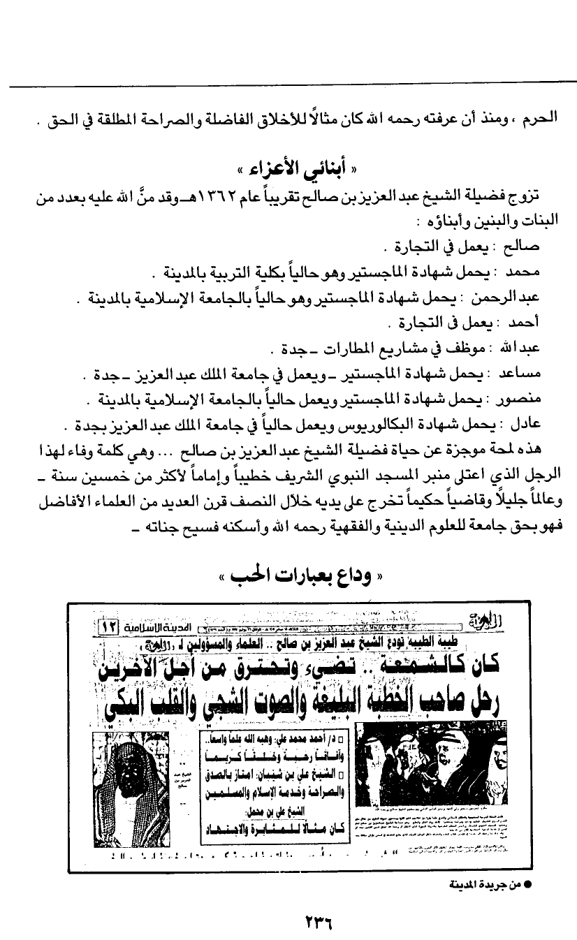 عادل: يحمل شهادة عن حياة فضيلة الشيخ عبد العزيز بن صالح .... وهي كلمة وفاء لهذا الرجل الذي اعتلى منبر المسجد النبوي الشريف خطيباً وإماماً لأكثر من خمسين سنة - وعالماً جليلاً وقاضياً حكيماً تخرج على يديه خلال النصف قرن العديد من العلماء الأفاضل فهو بحق جامعة للعلوم الدينية والفقهية رحمه الله وأسكنه فسيح جناته -