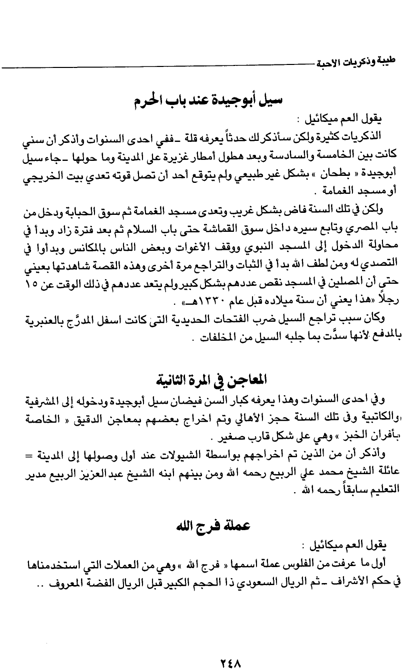 الذكريات كثيرة ولكن سأتذكر لك حدثاً يعرفه قلة - ففي احدى السنوات وأذكر ان سني كانت بين الخامسة والسادسة وبعد هطول امطار غزيرة على المدينة وما حولها - جاء سيل أبو جيدة ((بطحان)) بشكل غير طبيعي ولم يتوقع احد ان تصل قوته تعدي بيت الخريجي او مسجد الغمامة.