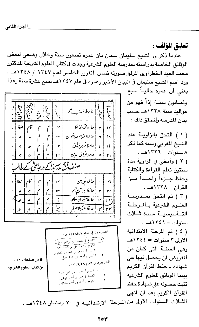 (4) ثم المرحلة الابتدائية الأولى 3 سنوات = 1344هـ وهي السنة التي كان من المفروض ان يحصل فيها على شهادة - حفظ القرآن الكريم بينما الوثائق للعلوم الشعرية تثبت حصوله على شهادة حفظ القرآن الكريم بعد أن أنهى الثلاث السنوات الأولى من المرحلة الابتدائية في 20 رمضان 1348هـ.