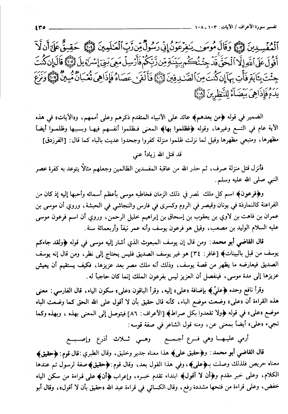 ثُمَّ بَعَثْنا مِنْ بَعْدِهِمْ مُوسى بِآياتِنا إِلى فِرْعَوْنَ وَمَلائِهِ فَظَلَمُوا بِها فَانْظُرْ كَيْفَ كانَ عاقِبَةُ الْمُفْسِدِينَ (١٠٣) وَقالَ مُوسى يا فِرْعَوْنُ إِنِّي رَسُولٌ مِنْ رَبِّ الْعالَمِينَ (١٠٤) حَقِيقٌ عَلى أَنْ لا أَقُولَ عَلَى اللَّهِ إِلاَّ الْحَقَّ قَدْ جِئْتُكُمْ بِبَيِّنَةٍ مِنْ رَبِّكُمْ فَأَرْسِلْ مَعِيَ بَنِي إِسْرائِيلَ (١٠٥) قالَ إِنْ كُنْتَ جِئْتَ بِآيَةٍ فَأْتِ بِها إِنْ كُنْتَ مِنَ الصَّادِقِينَ (١٠٦) فَأَلْقى عَصاهُ فَإِذا هِيَ ثُعْبانٌ مُبِينٌ (١٠٧)